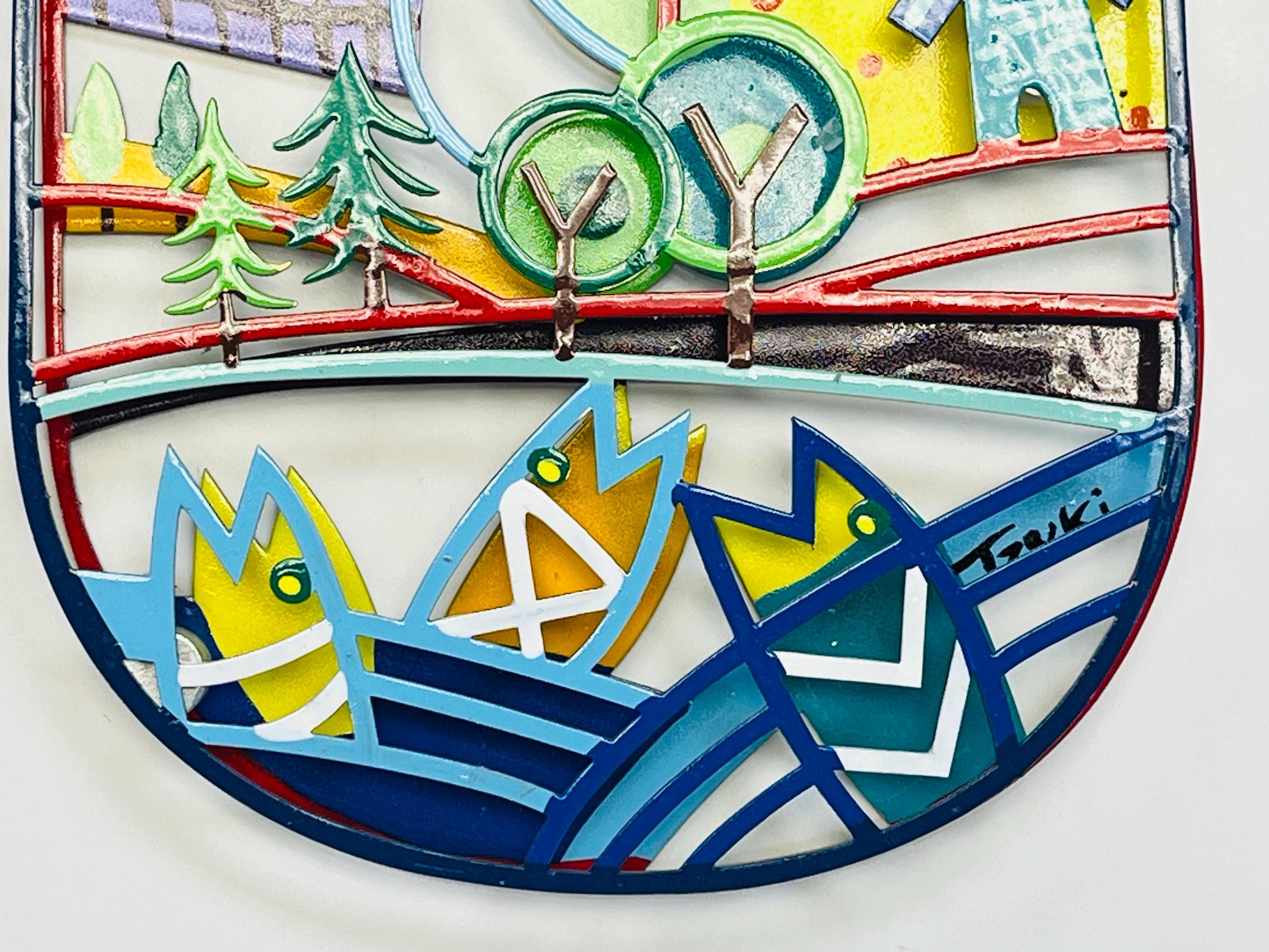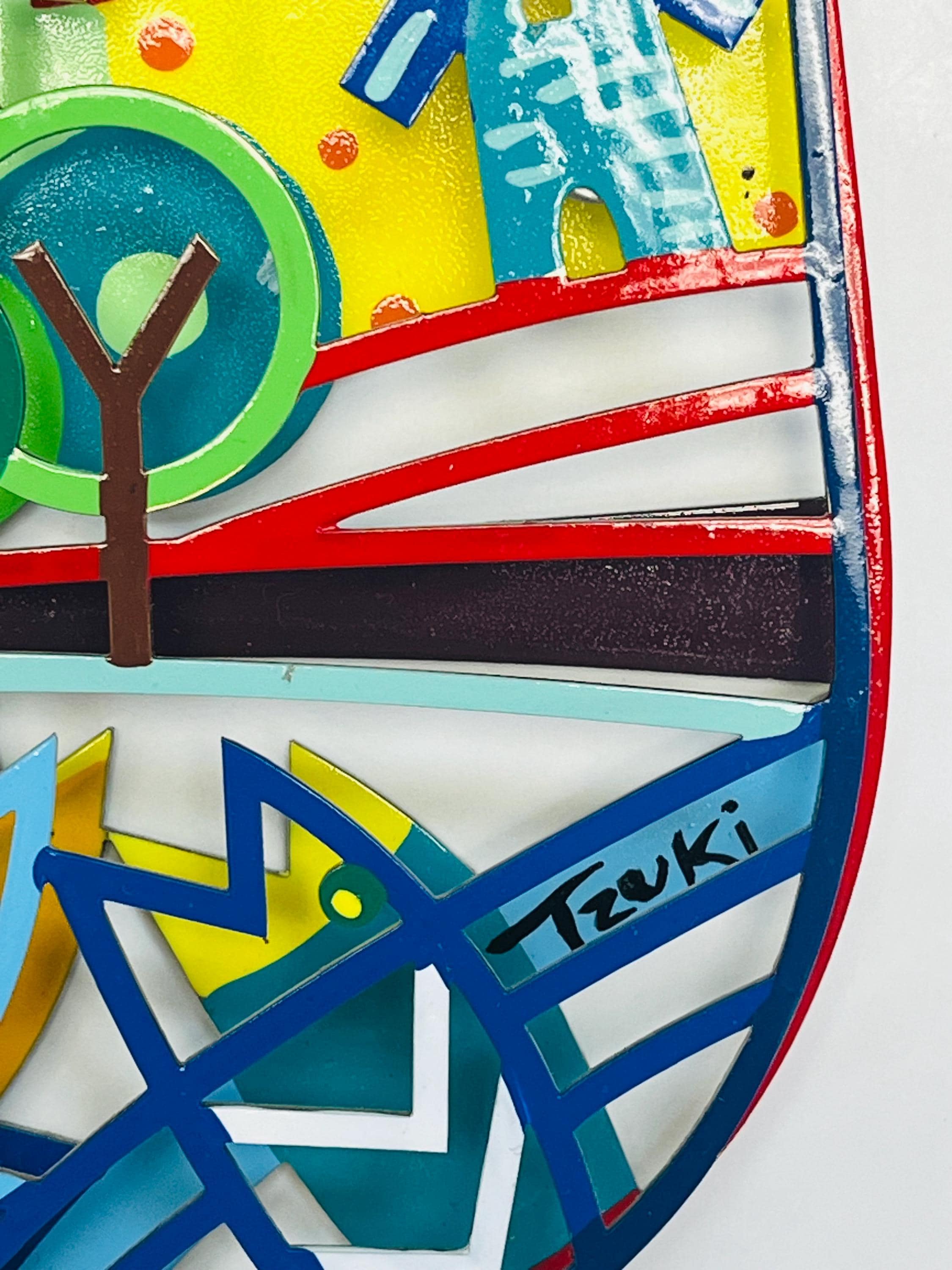 Shay Peled is the artist behind the name Tzuki Art. Tzuki's extensive collection includes unique Judaica art and modern pop art sculptures. In jewish tradition the hamsa hand is believed to bring good fortune, success or any kind of positive energy while warding off the evil eye. Made of cold rolled steel, recycled metal, which has been laser cut, galvanised, spray and hand painted.