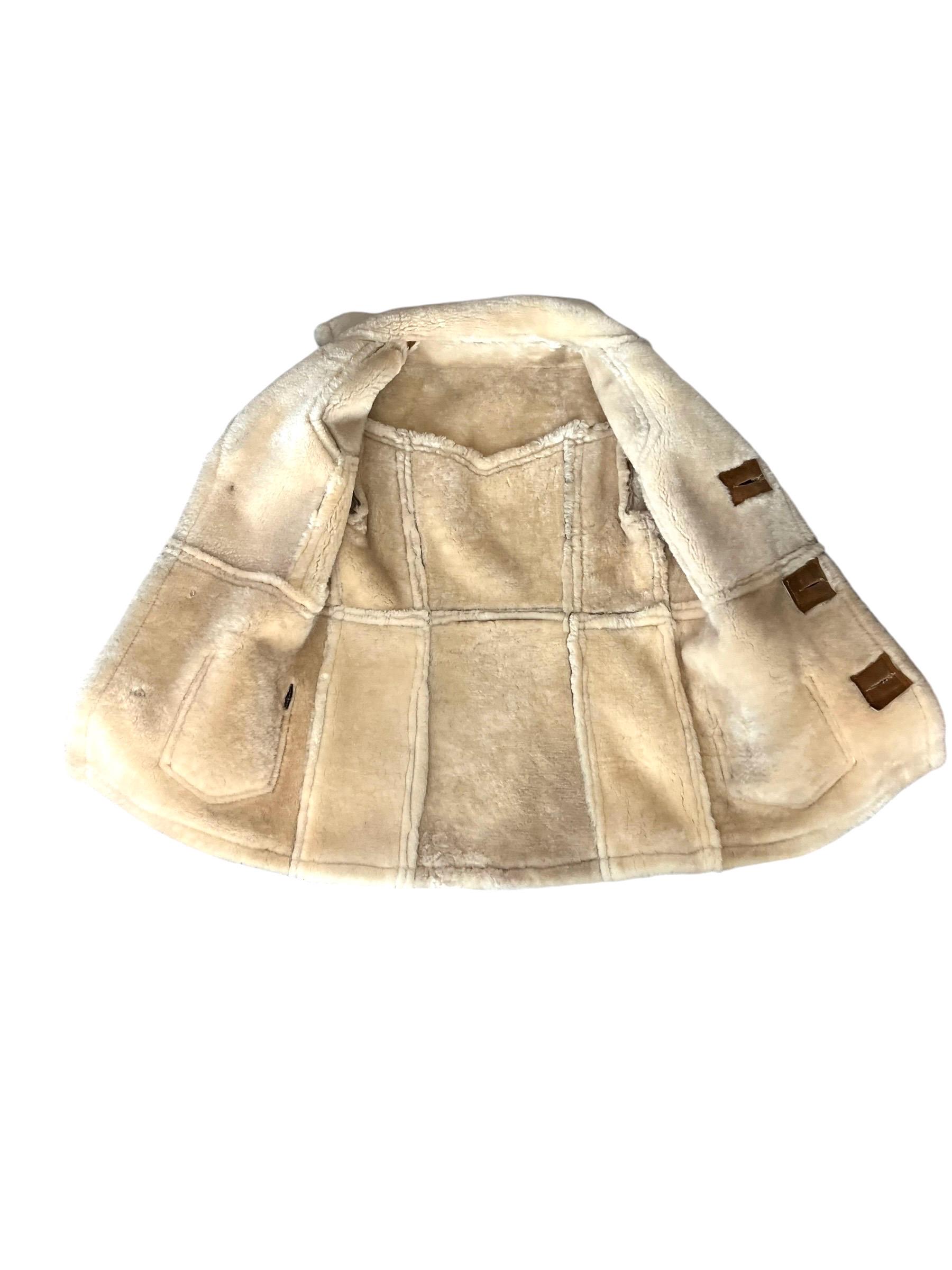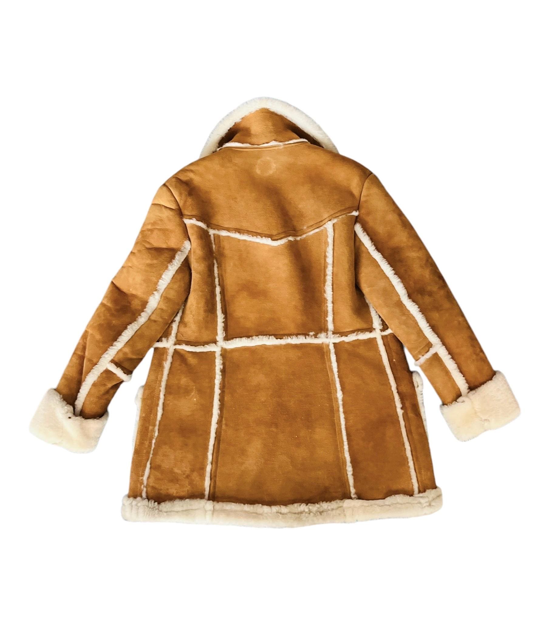 Luxurious single-breasted coat is crafted of velvety plush shearling. Exposed Shearling Seams. This iconic style features Large Notched Collar, 2 roomy patch pockets.