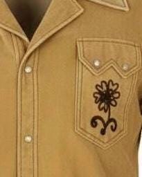 Dark brown floral chainstitch embroidery on the chest pockets.