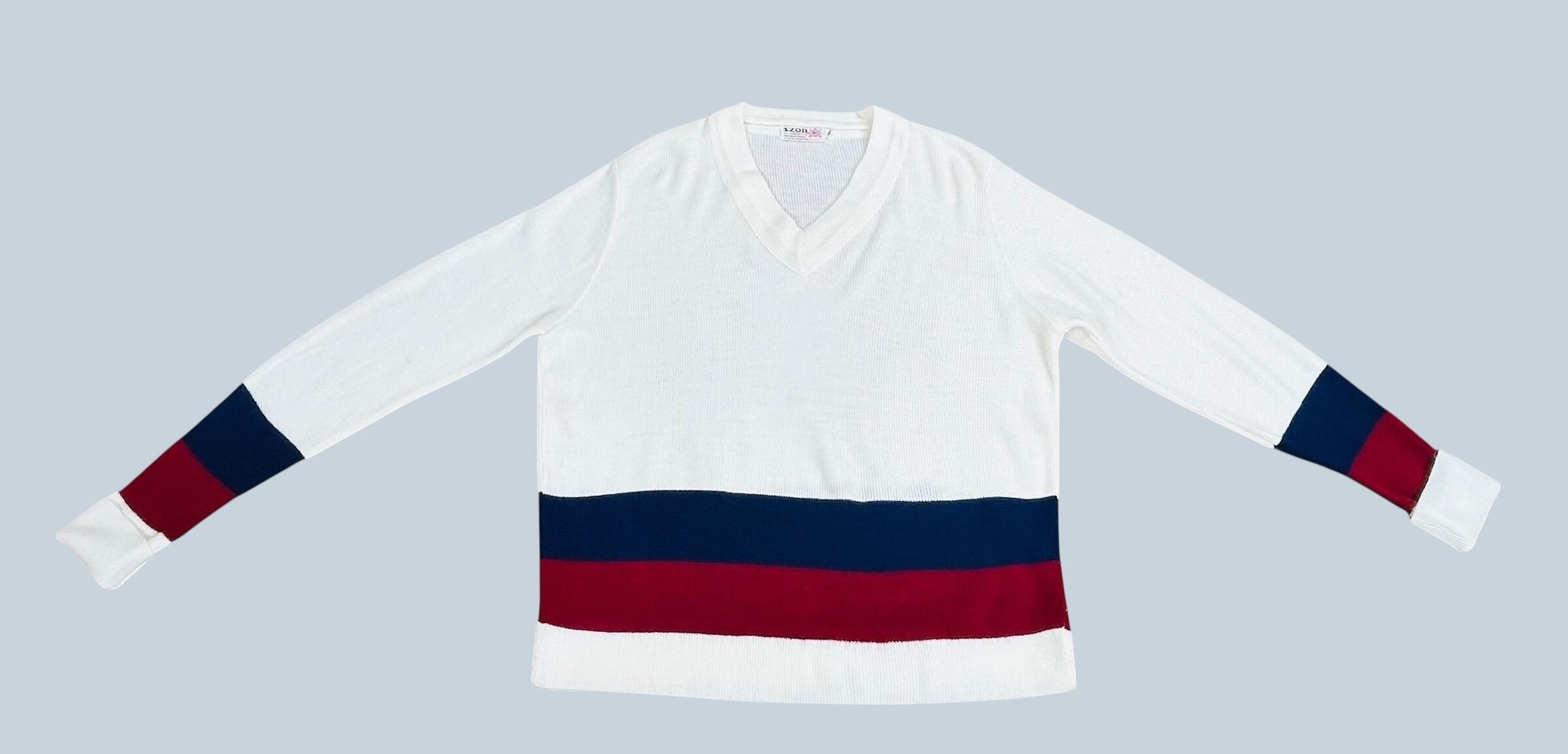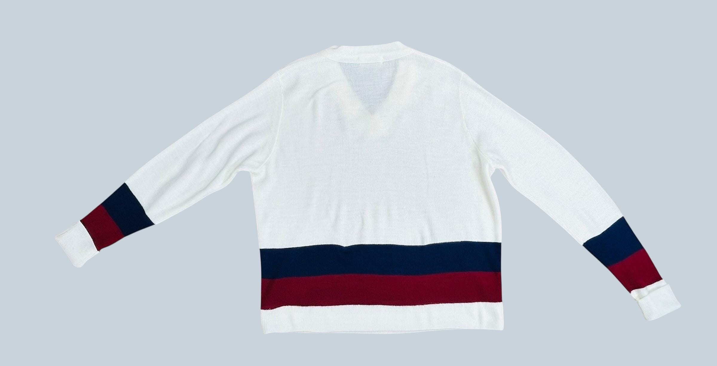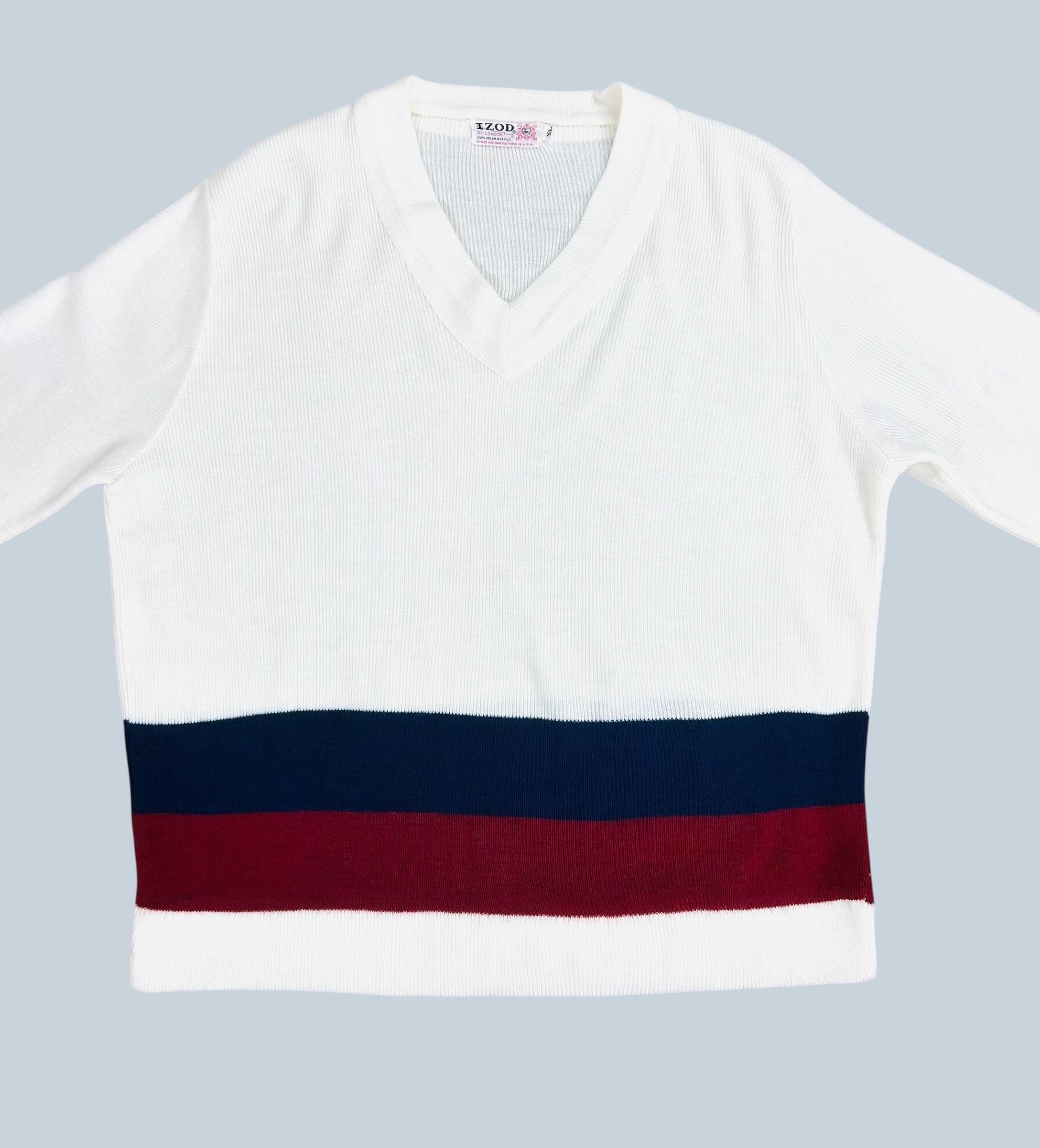 White ribbed-knit V-neck sweater, featuring distinctive navy blue and burgundy color block stripes across the lower body and the cuffs. This is a design characteristic of vintage preppy tennis style sweaters of the era.