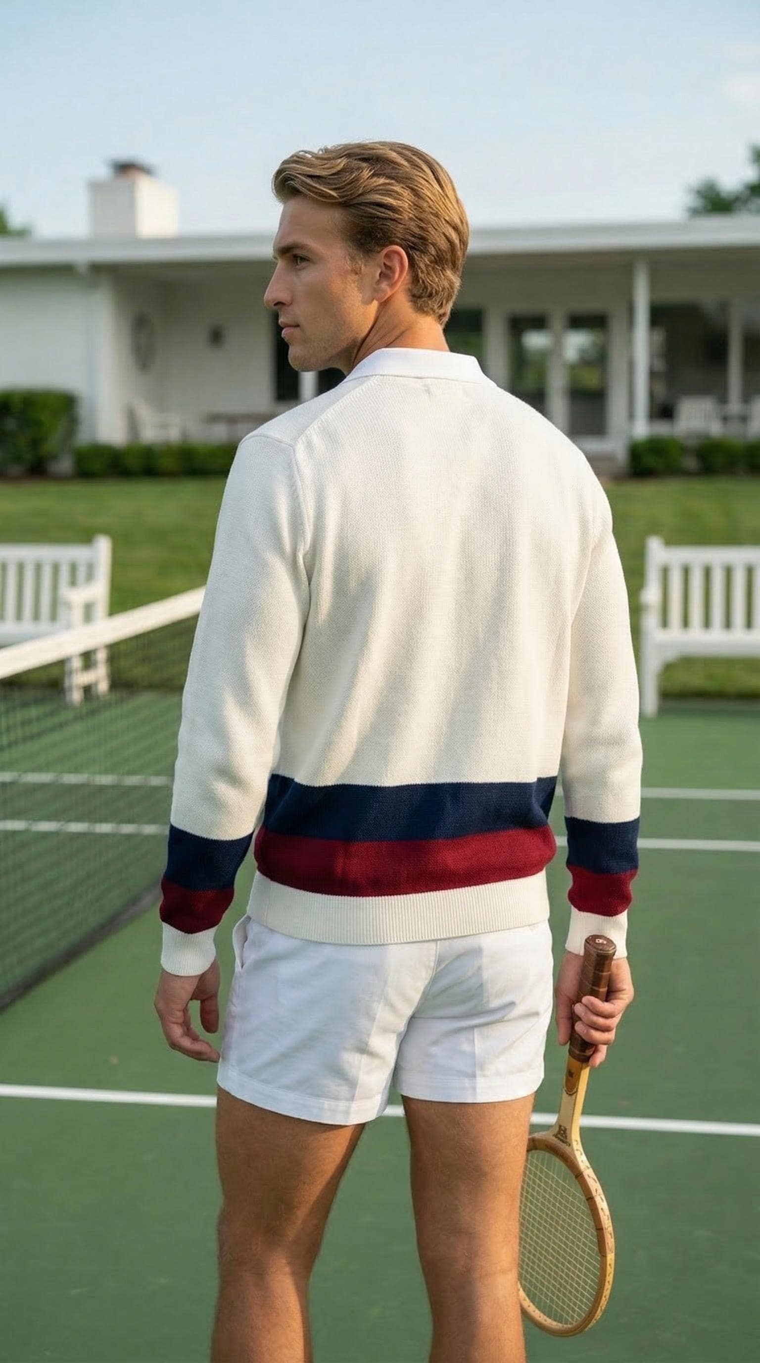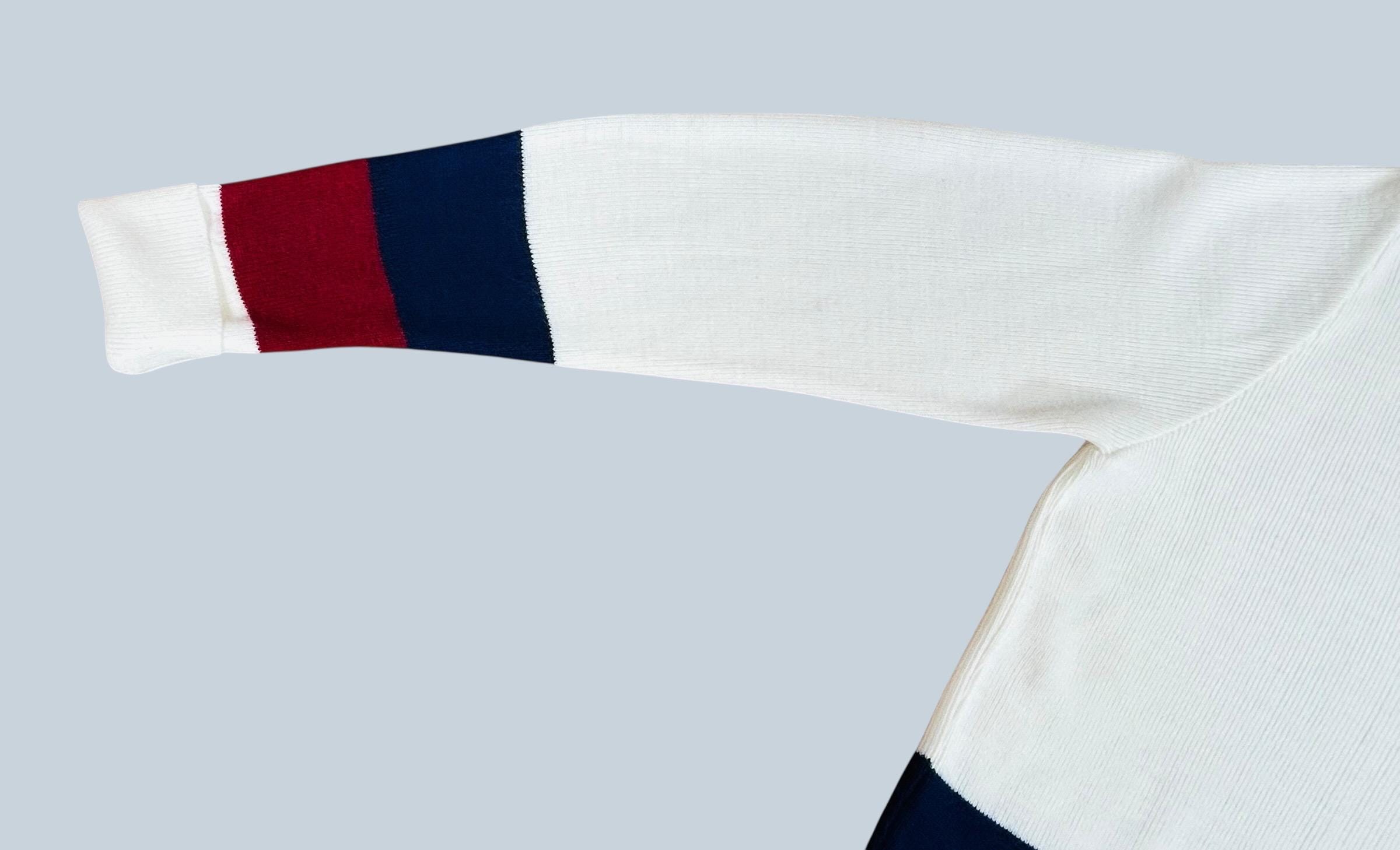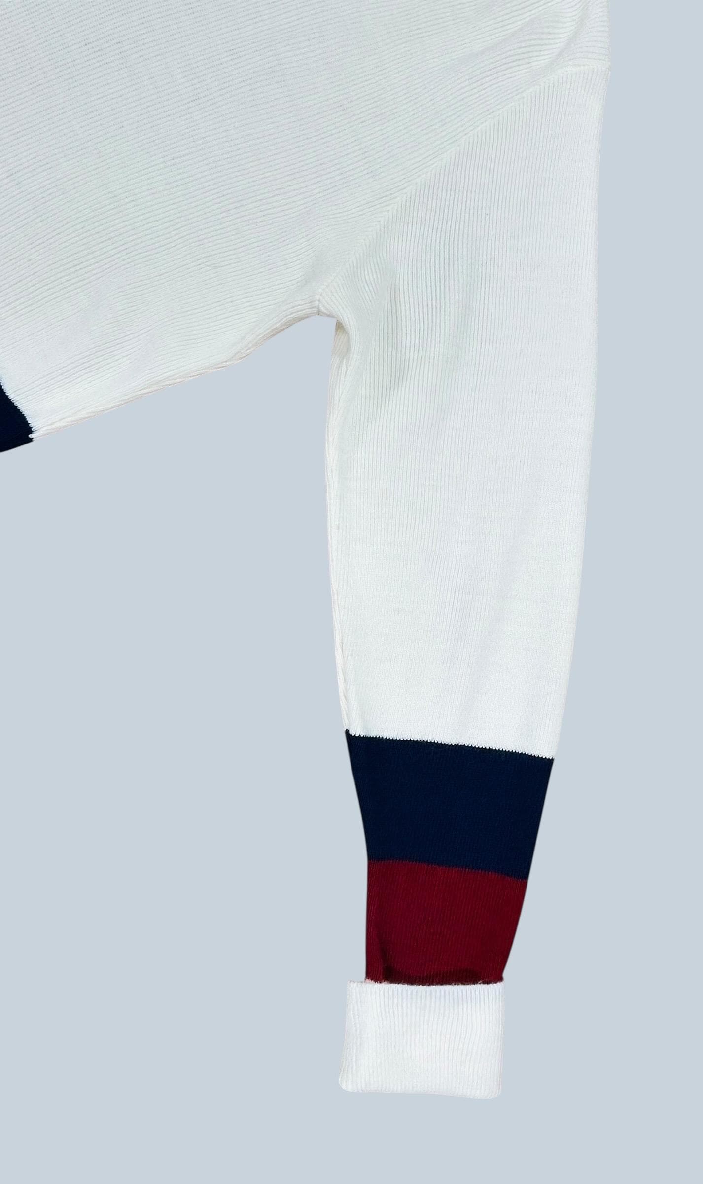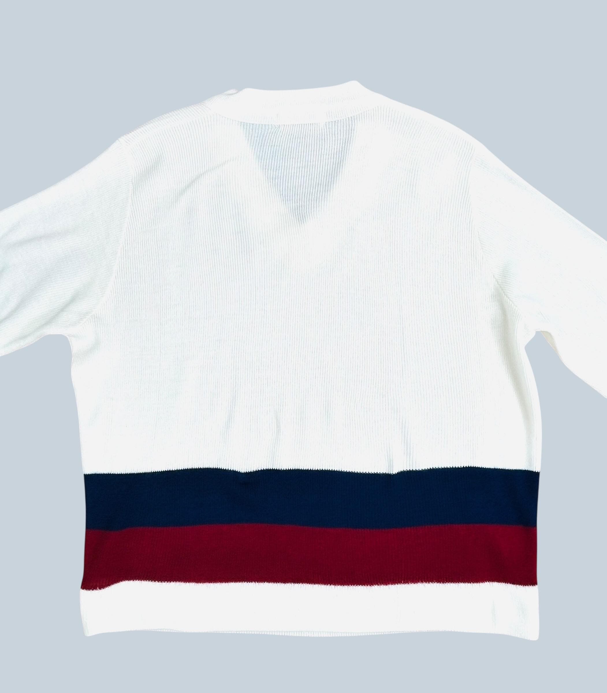 White ribbed-knit V-neck sweater, featuring distinctive navy blue and burgundy color block stripes across the lower body and the cuffs. This is a design characteristic of vintage preppy tennis style sweaters of the era.
