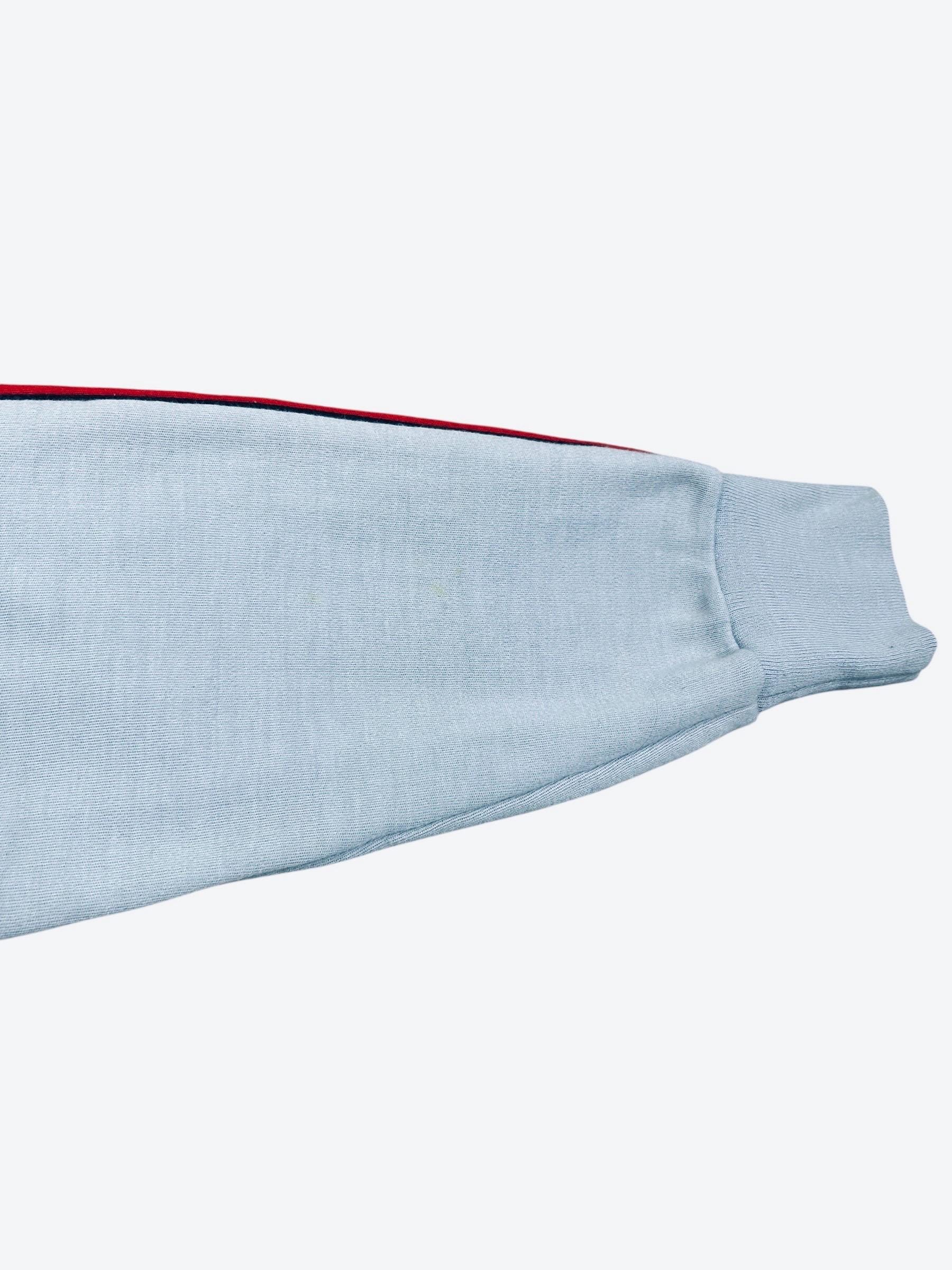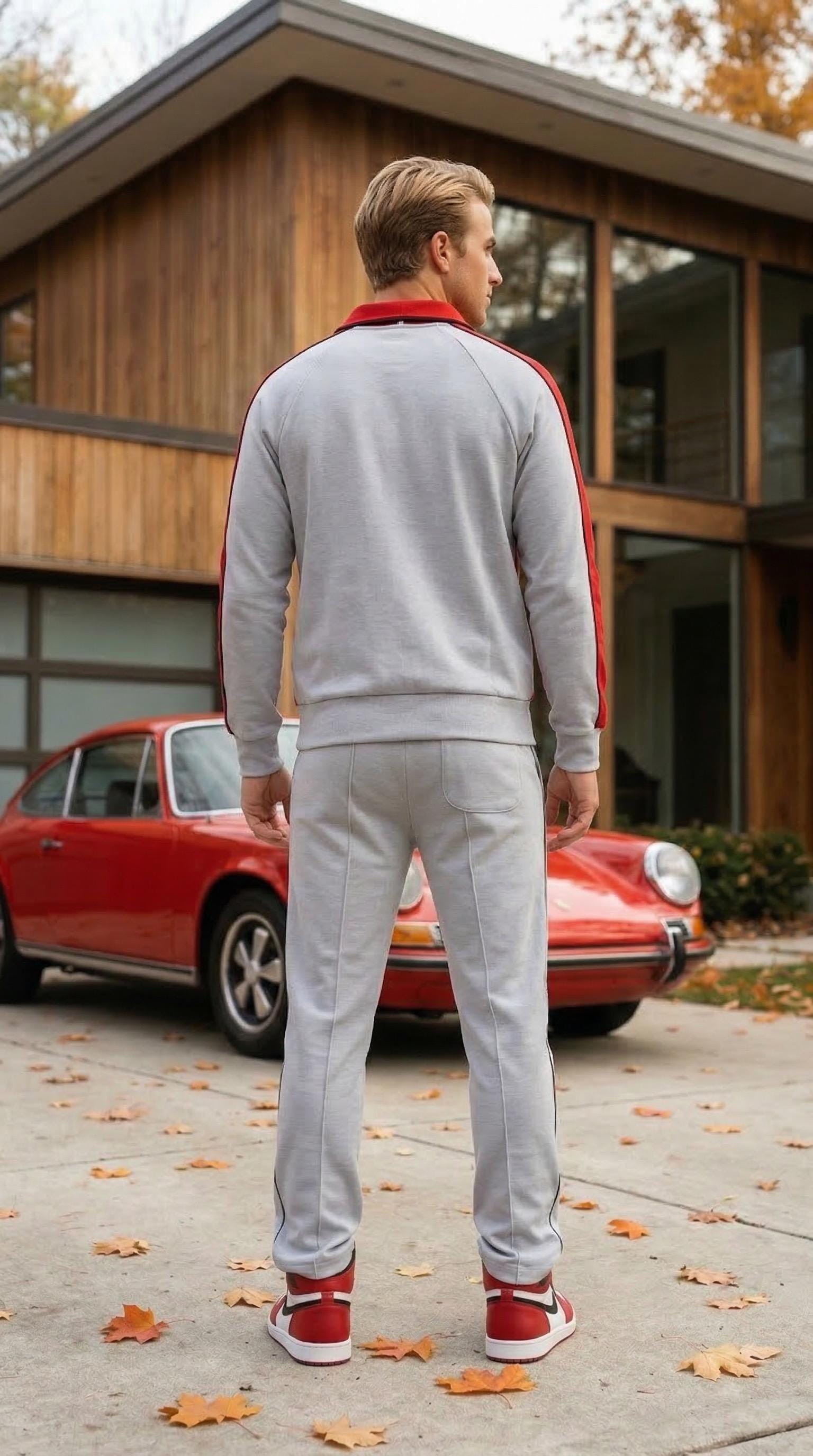 Colors are light gray with bright red color blocking and black stripes. Pants have a black stripe down the sides.
