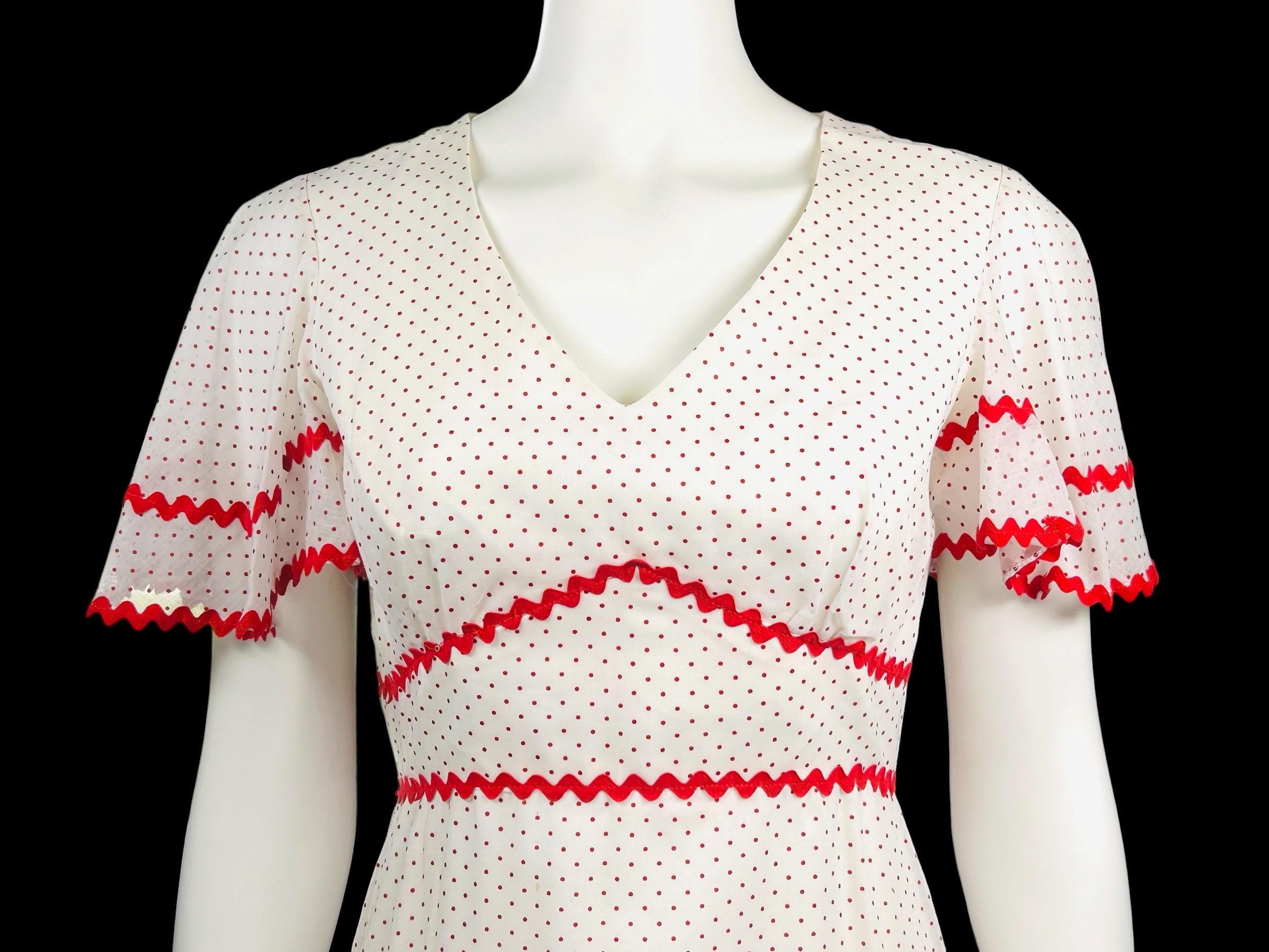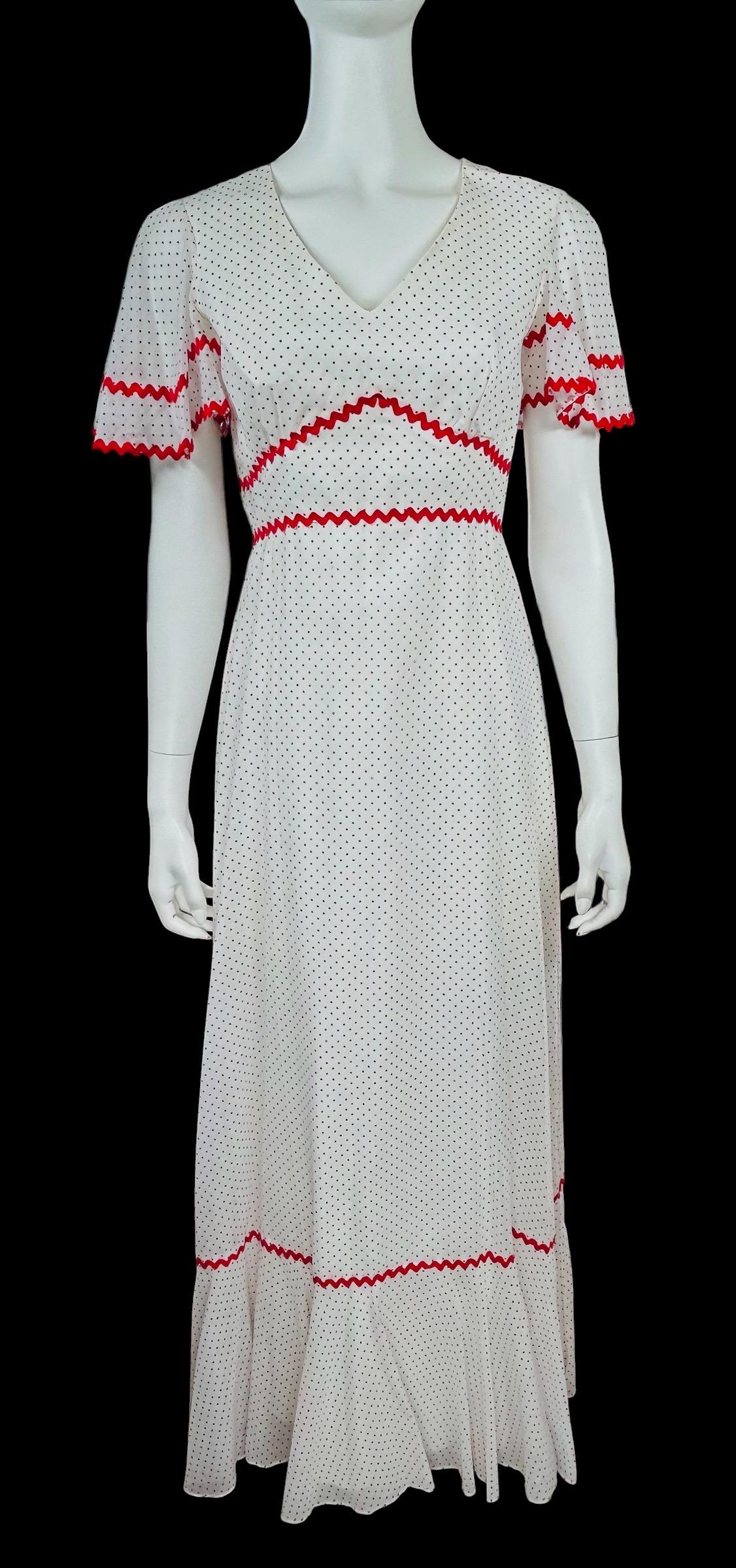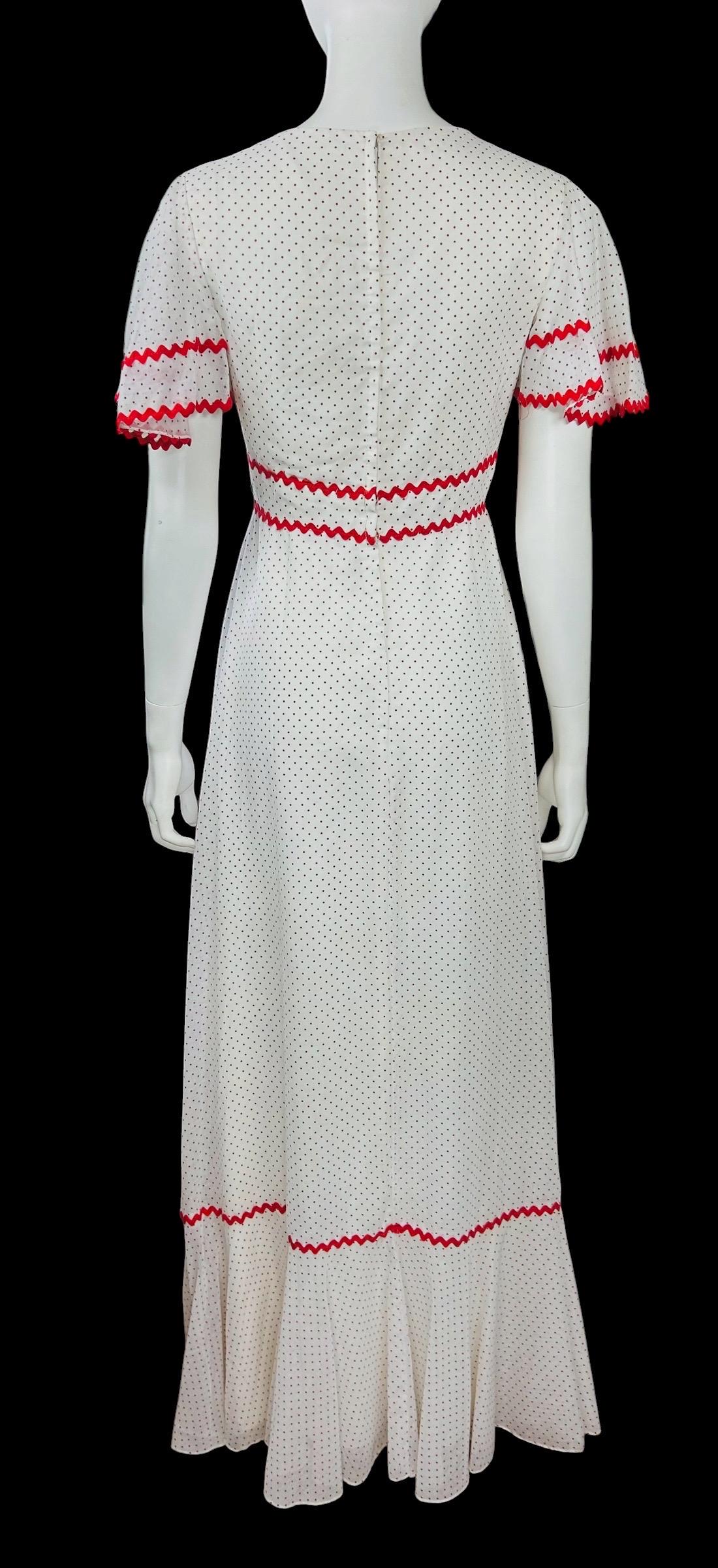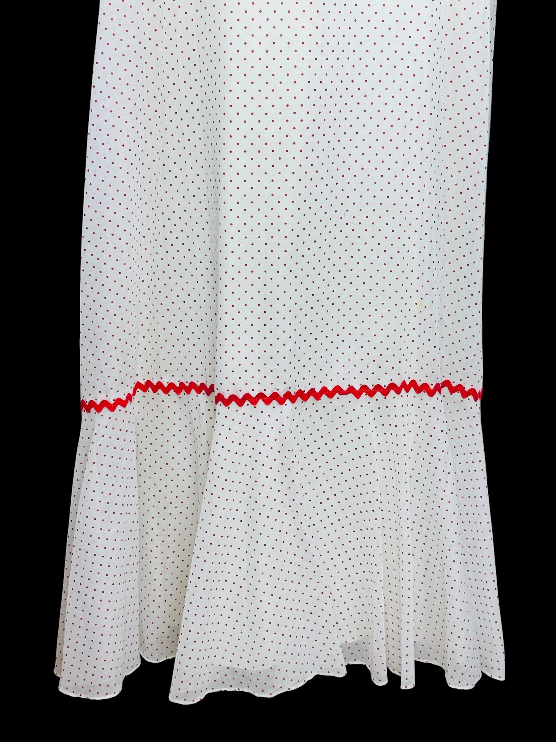Vintage 1970's maxi dress featuring a red Swiss polka dot pattern accented with red ric rac trim.