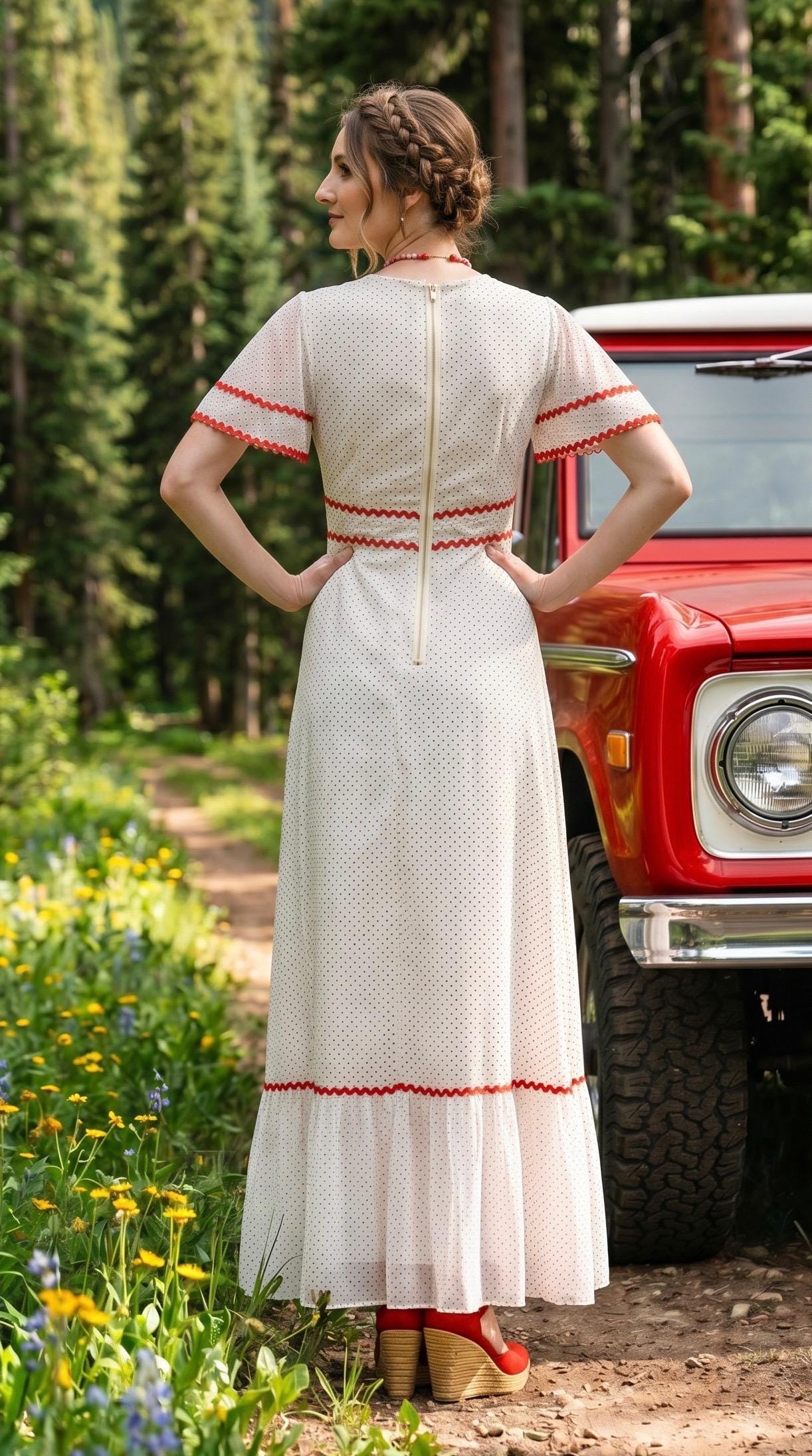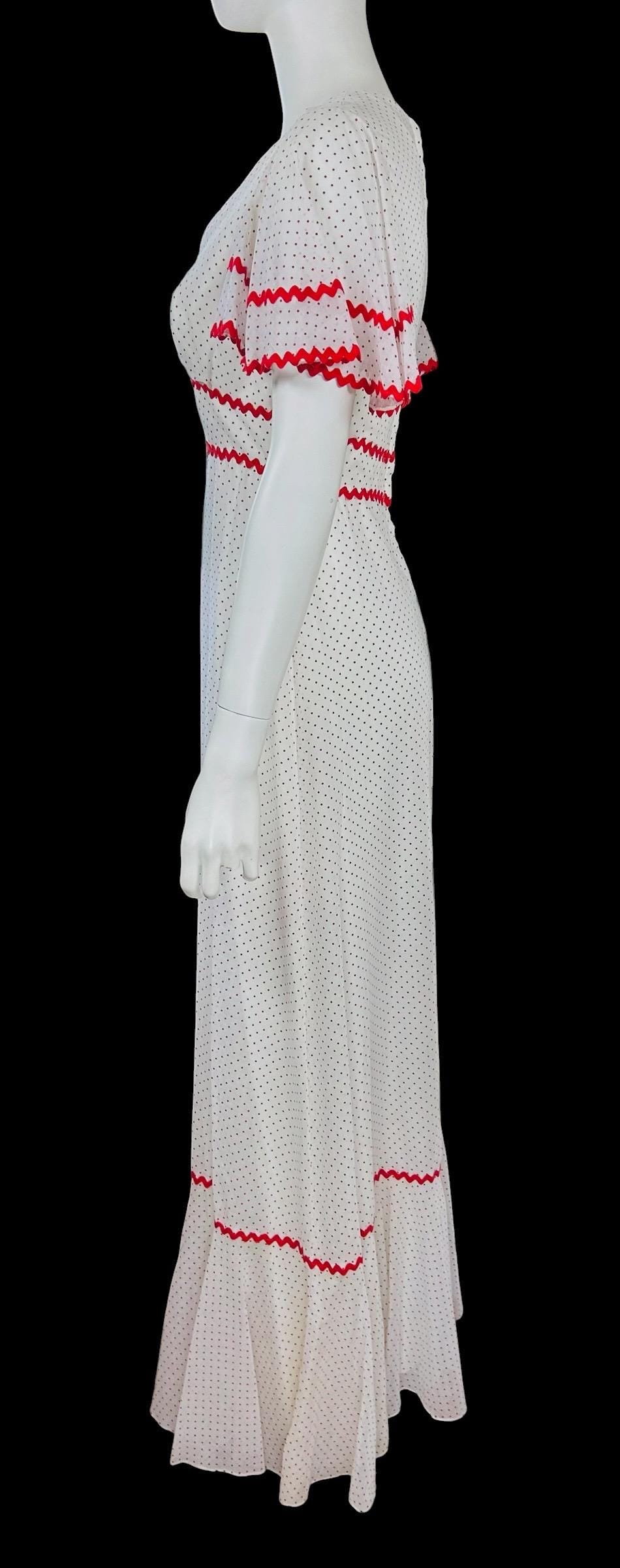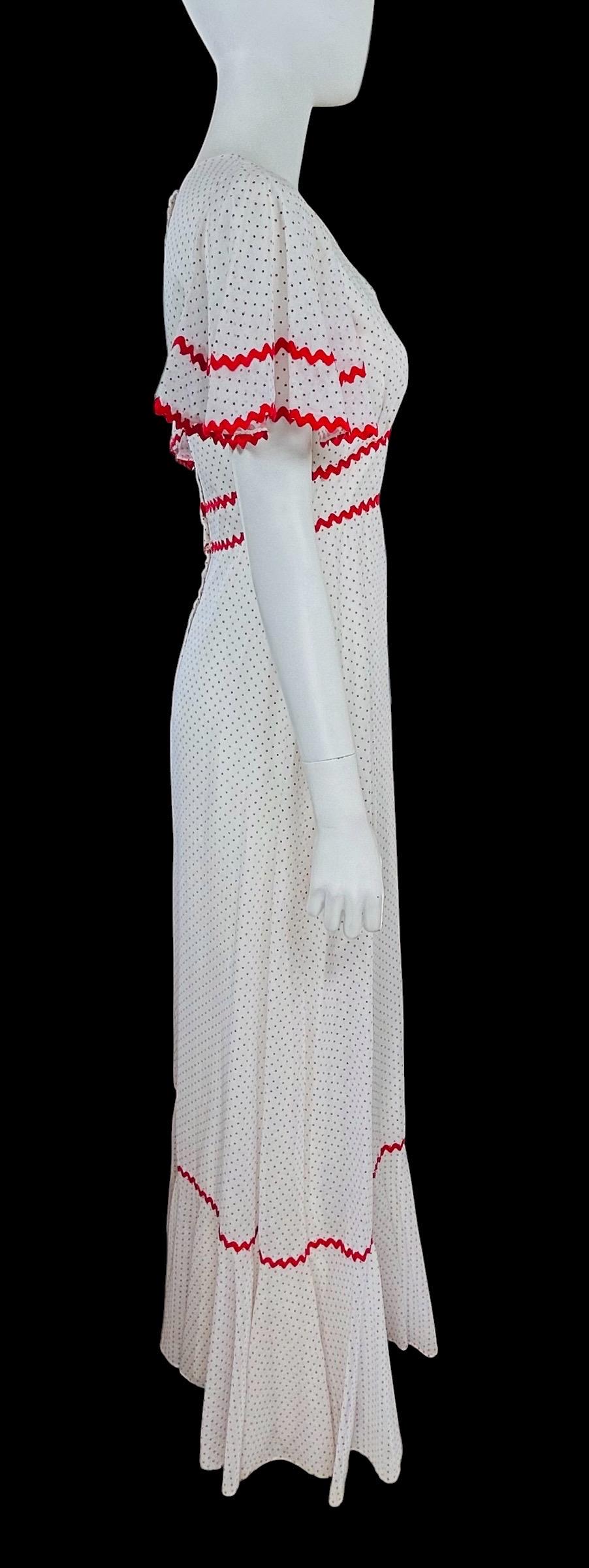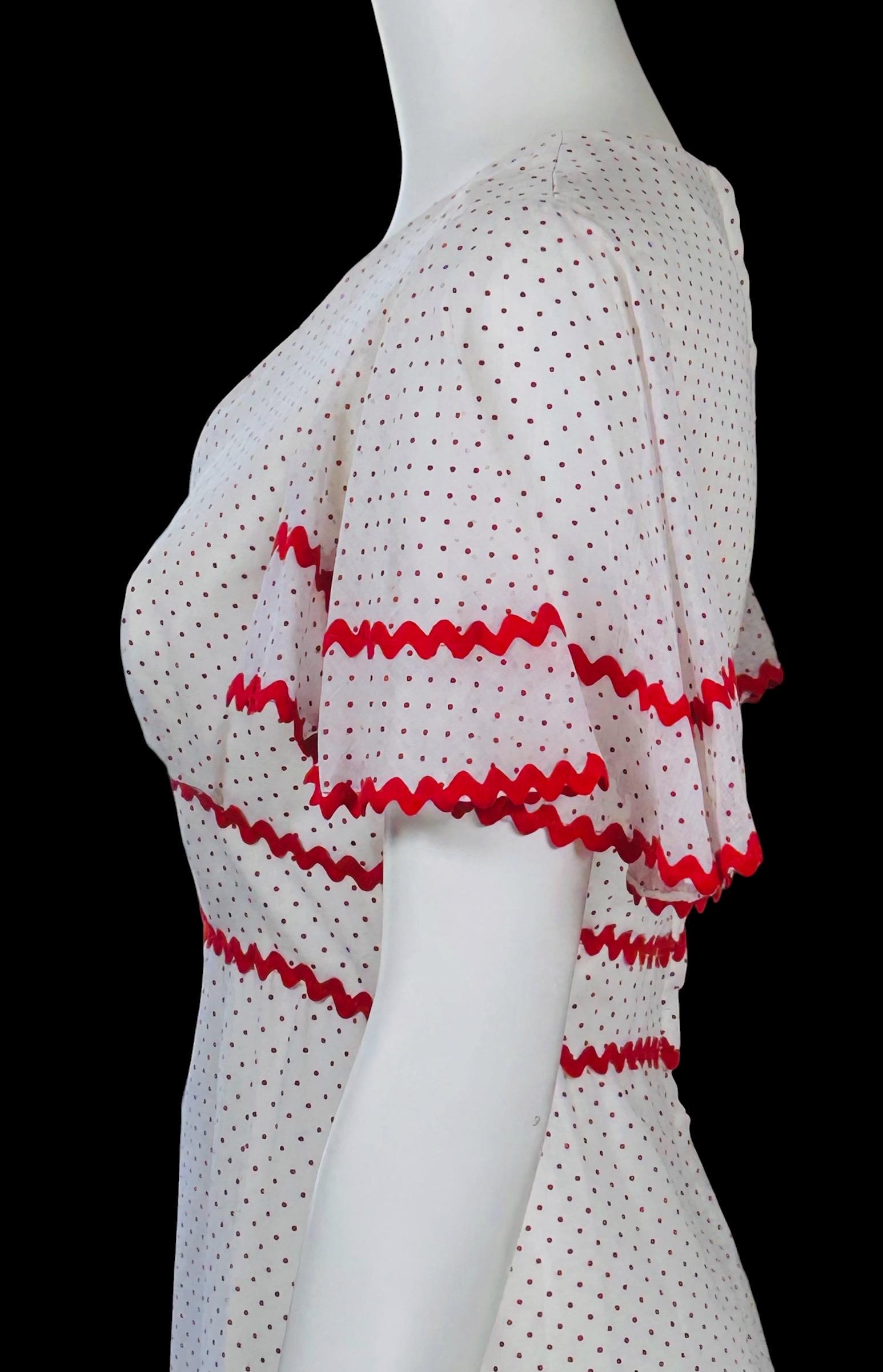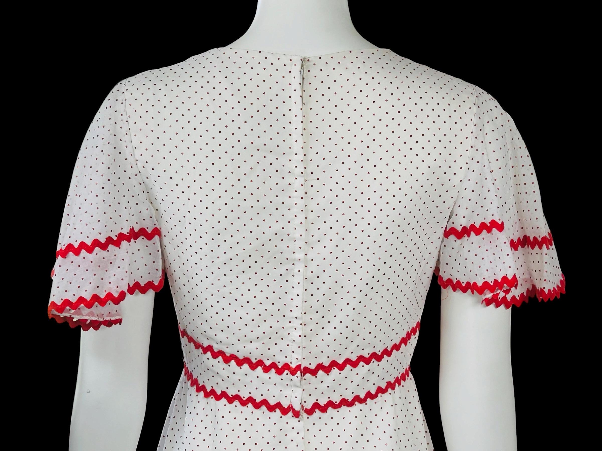 Vintage 1970's maxi dress featuring a red Swiss polka dot pattern accented with red ric rac trim.