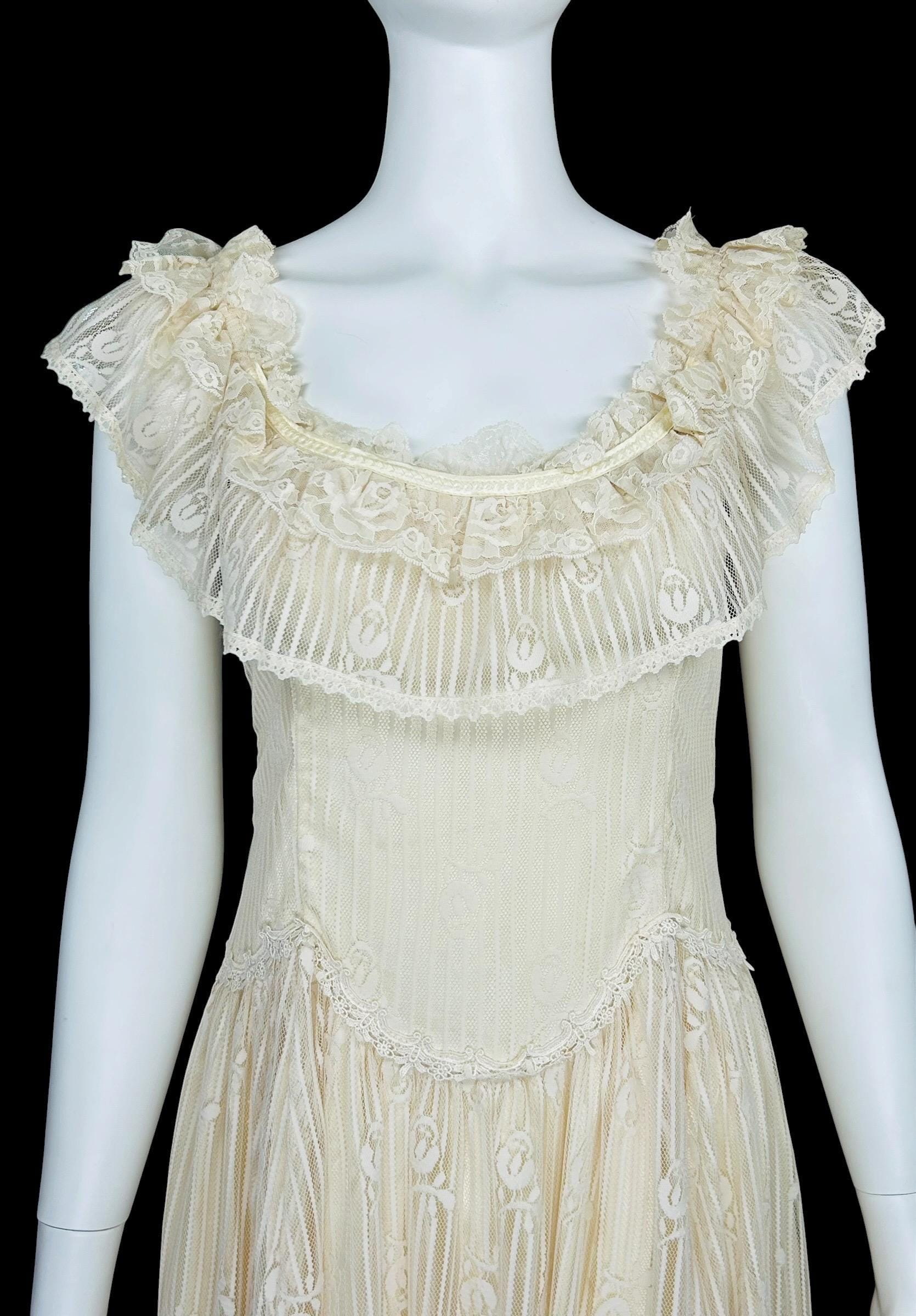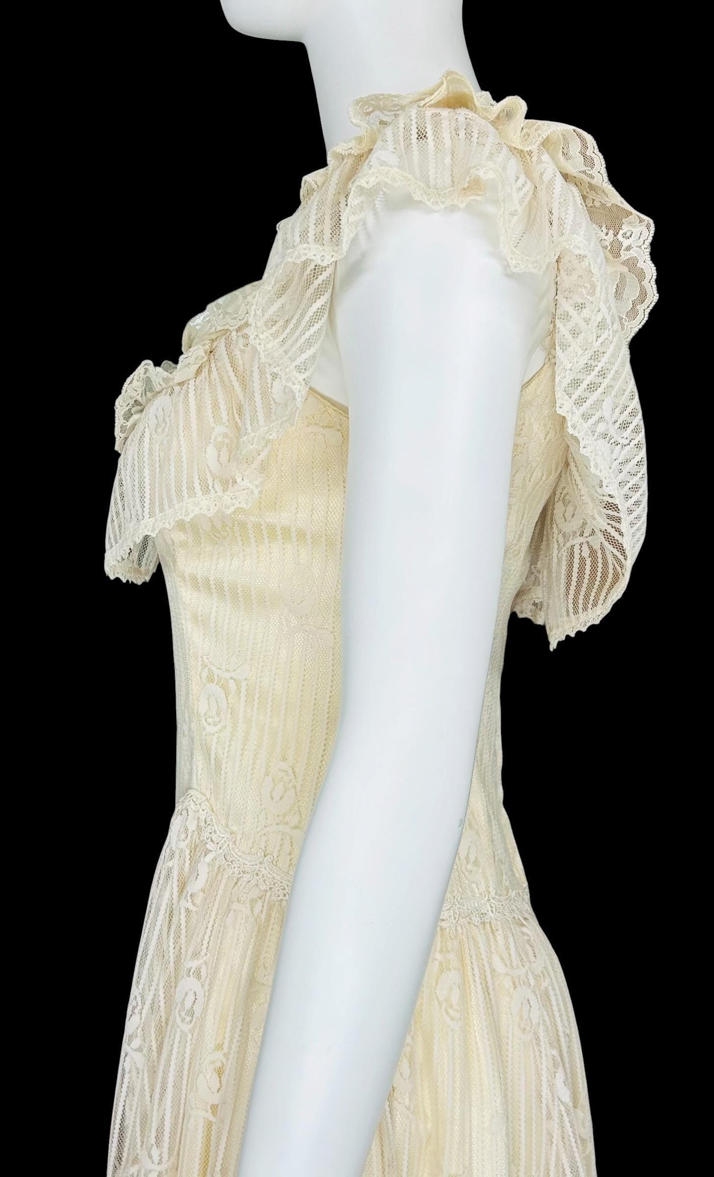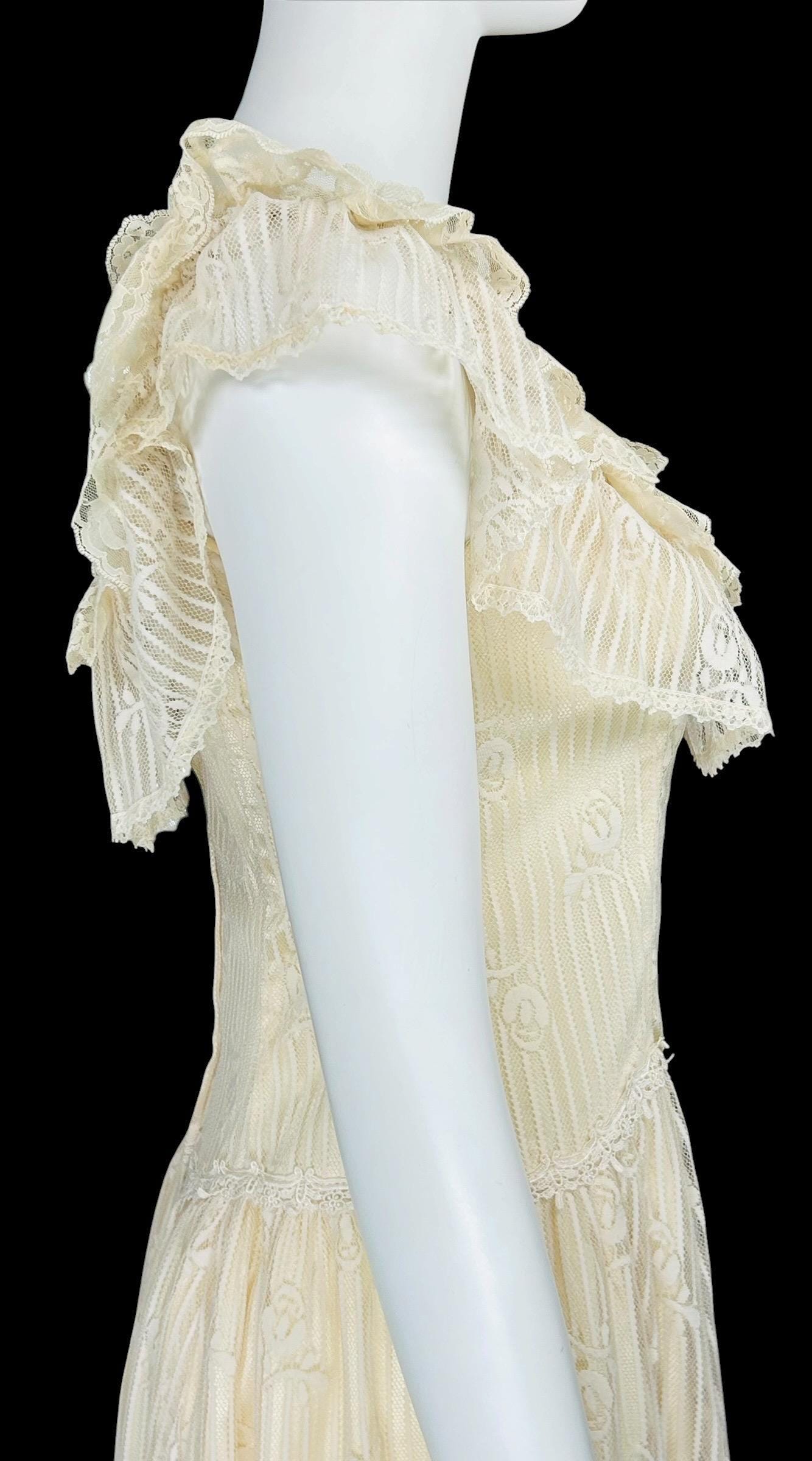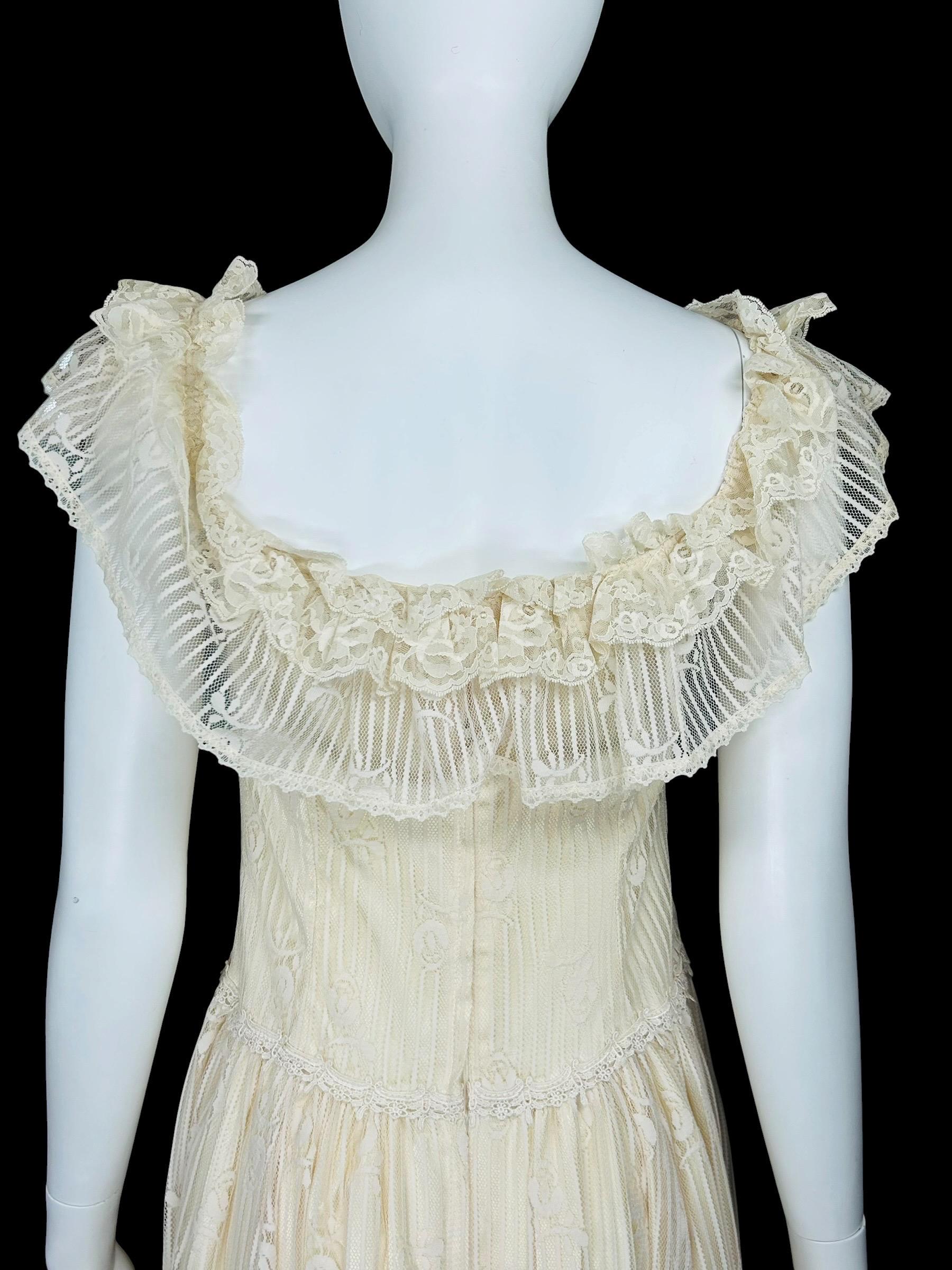 Vintage 70s / 80s Gunne Sax cream lace gown with a ruffled neckline perfect for a formal occasion or as a wedding Dress.