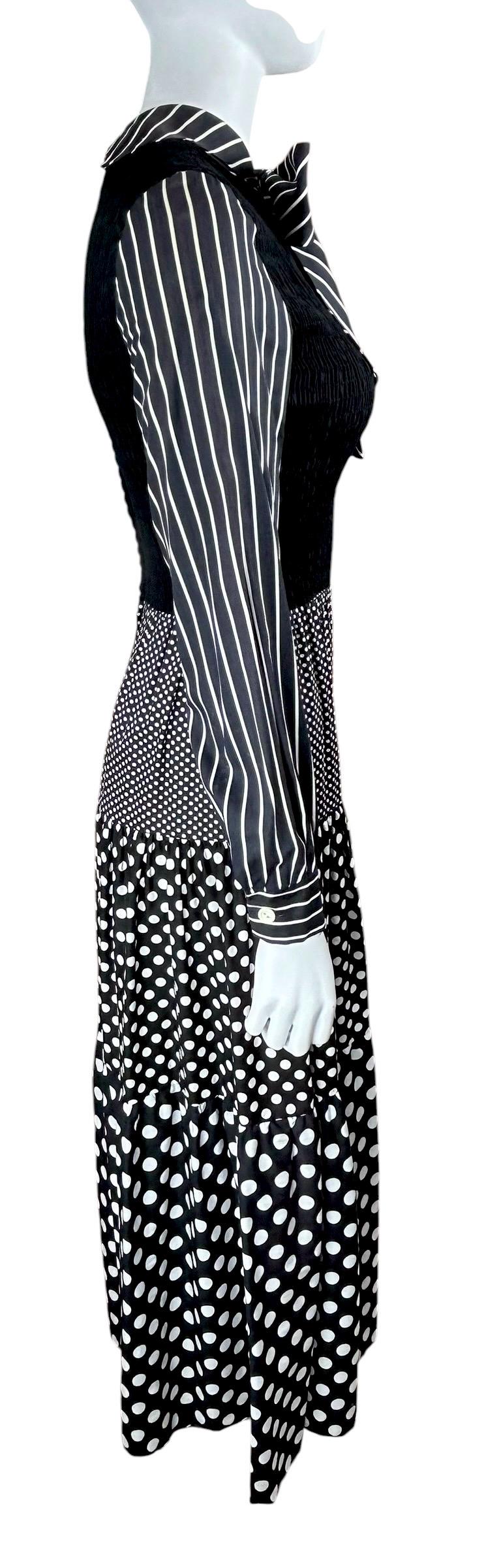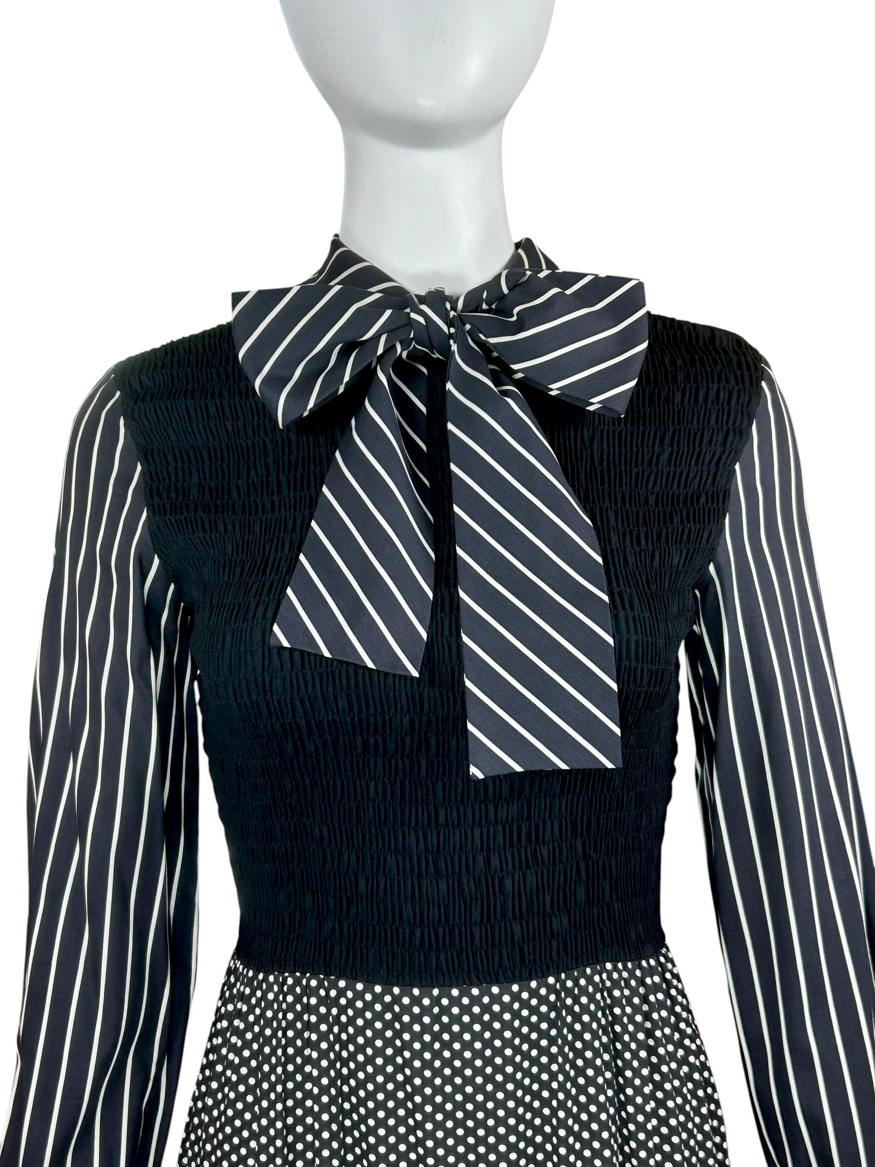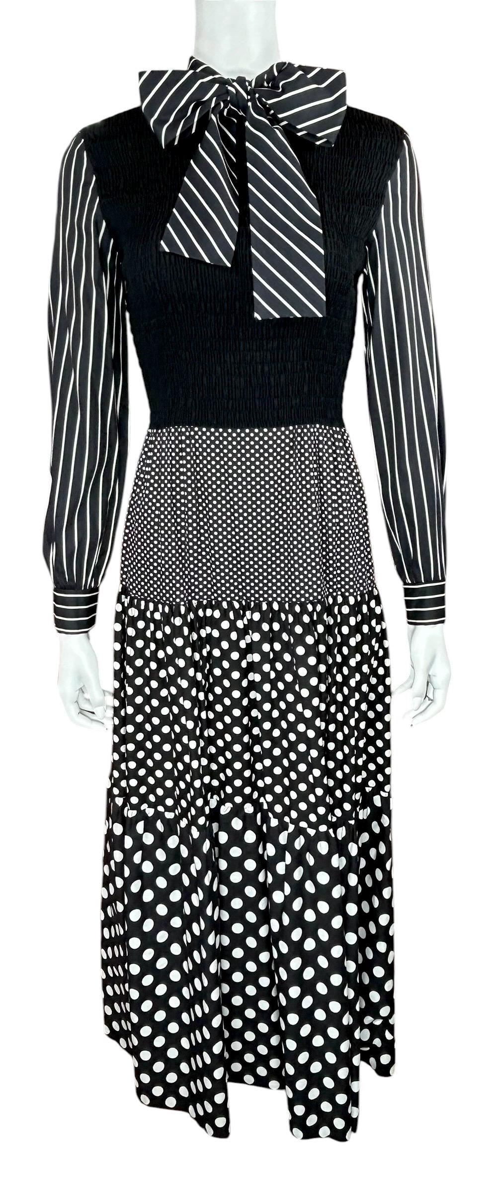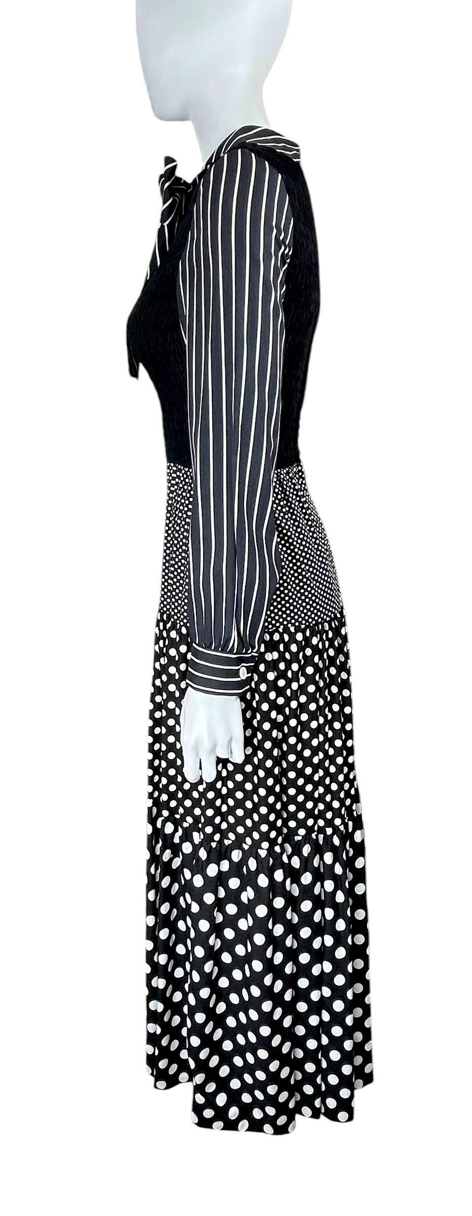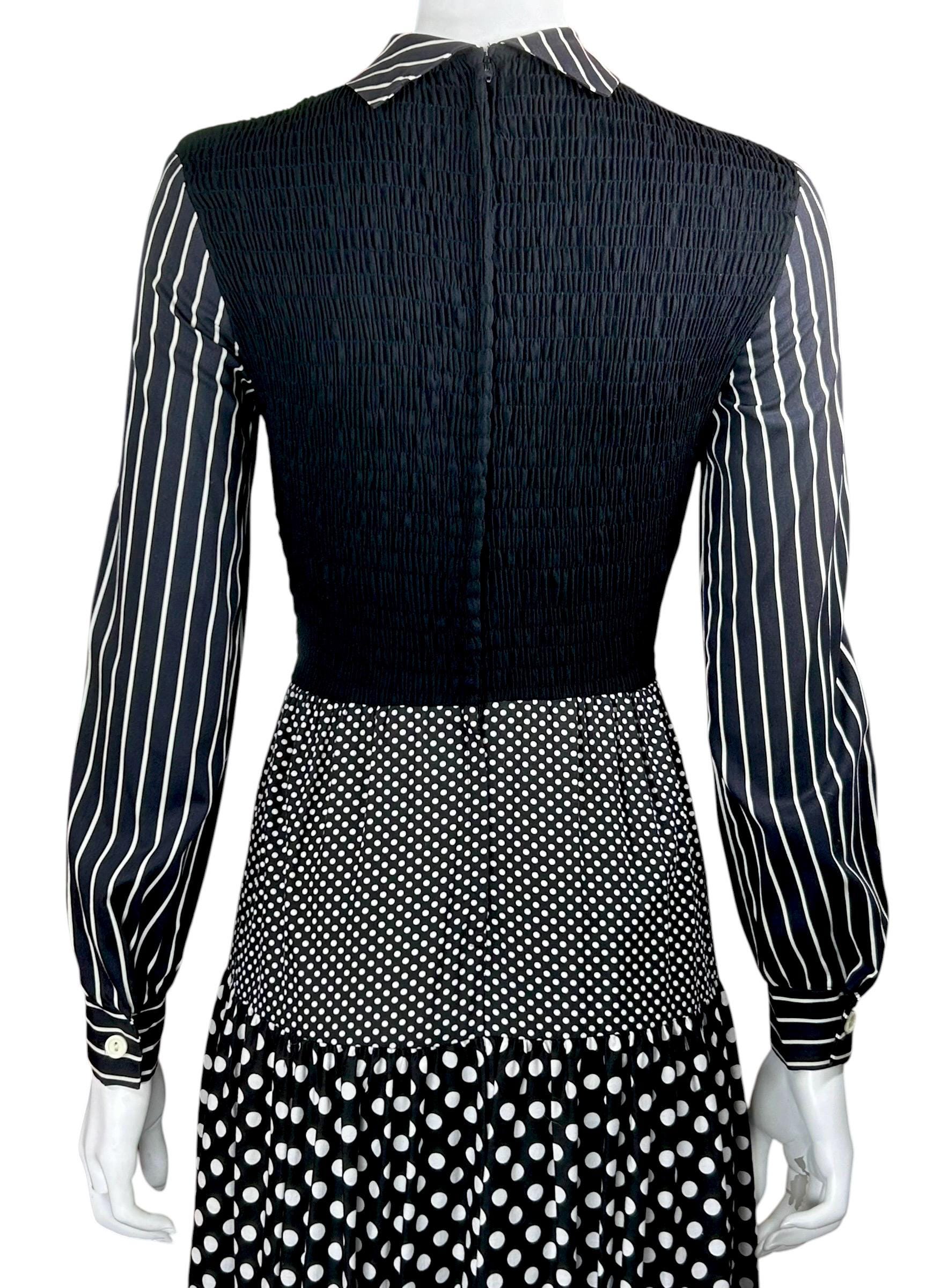 This dress is a classic example of 1970's mixed-print design, a style that often combined bold, contrasting patterns like polka dots and stripes into a single maximalist look.