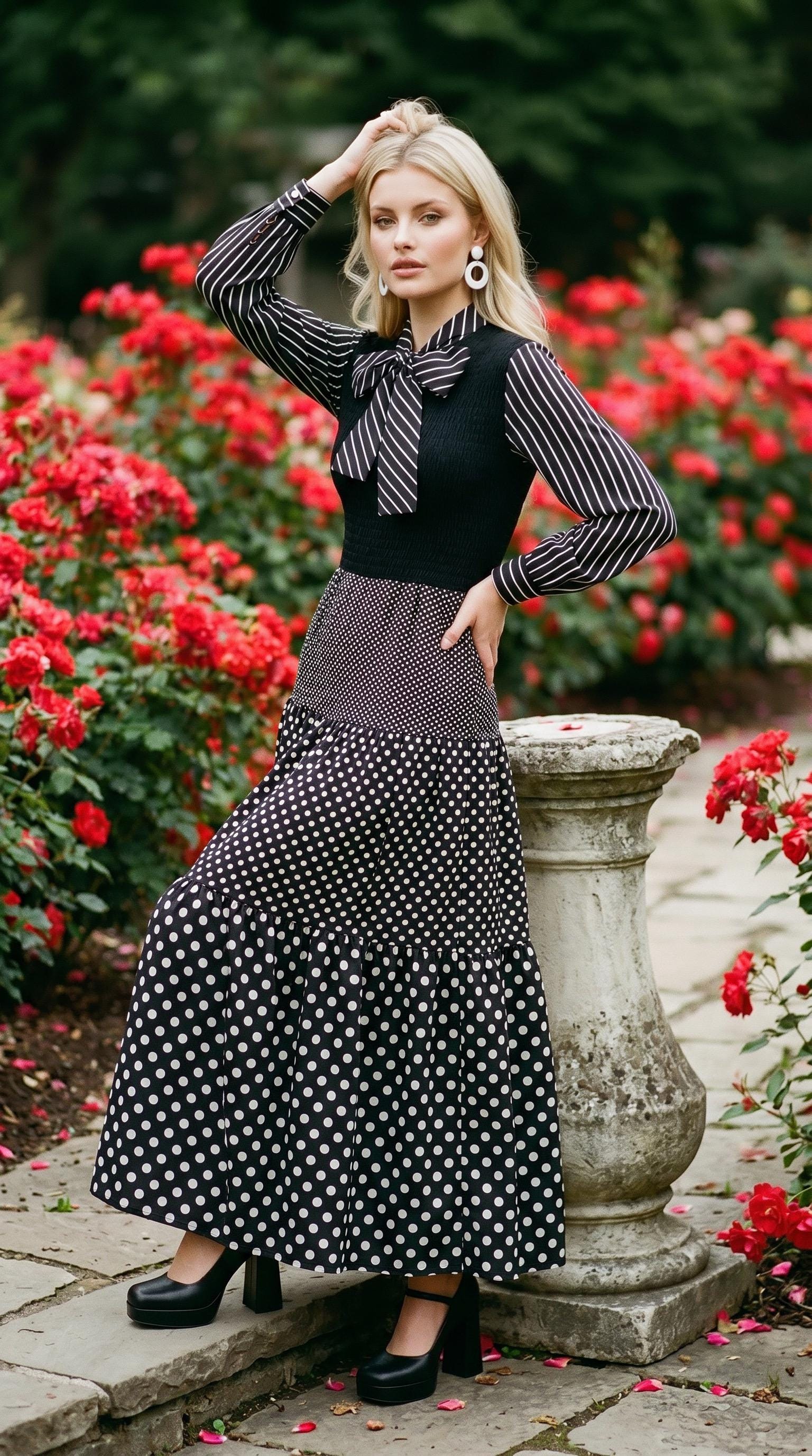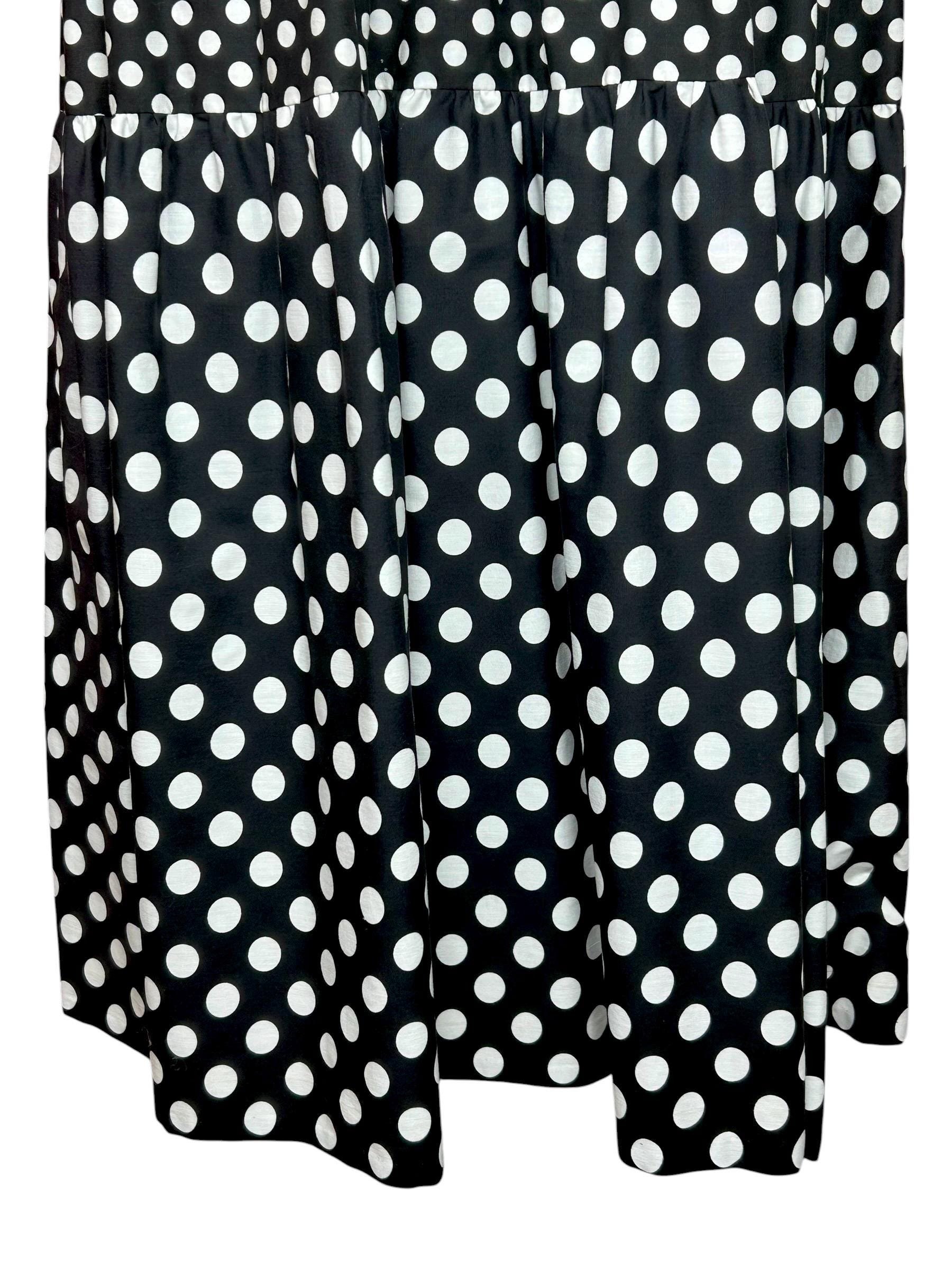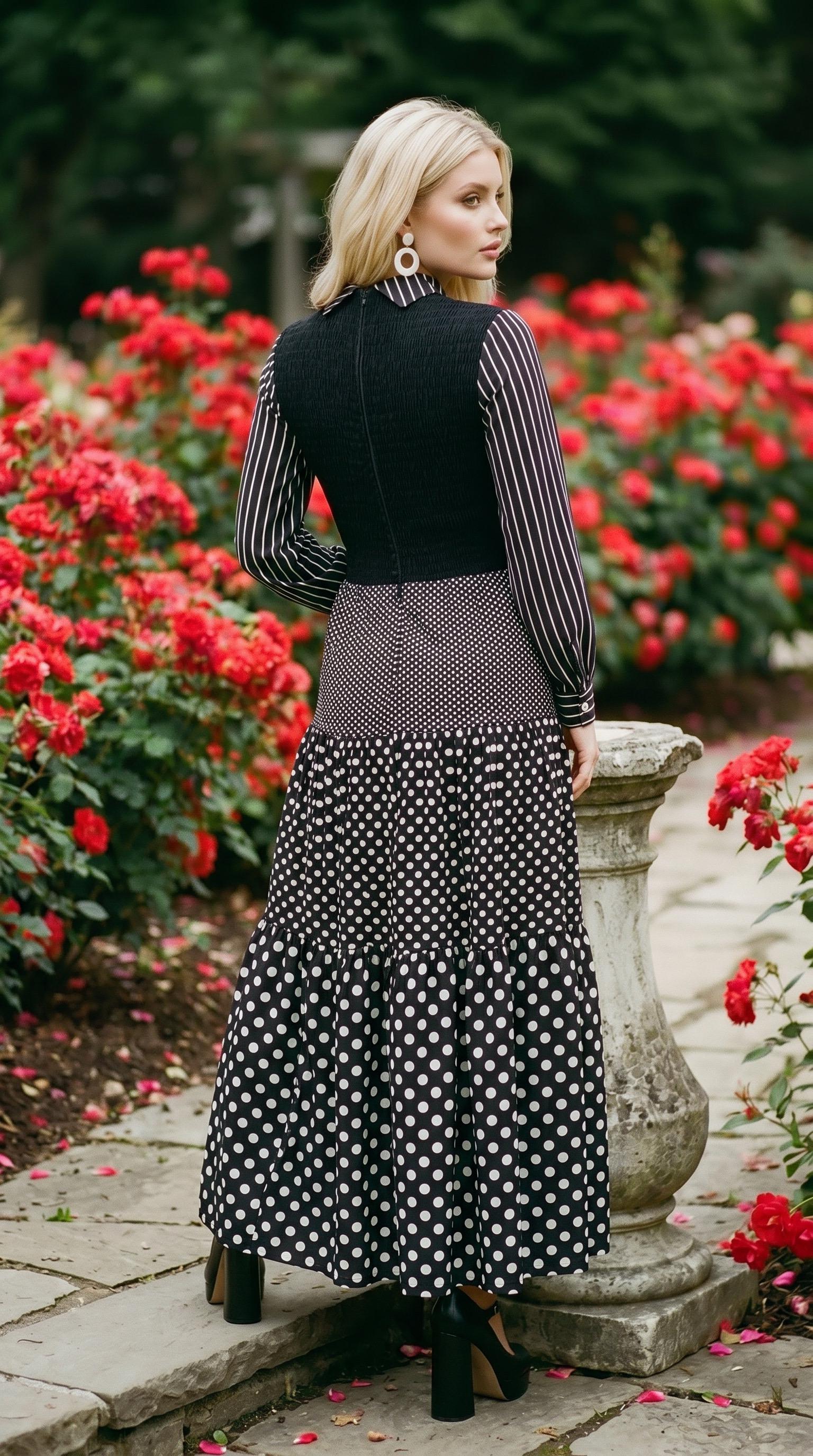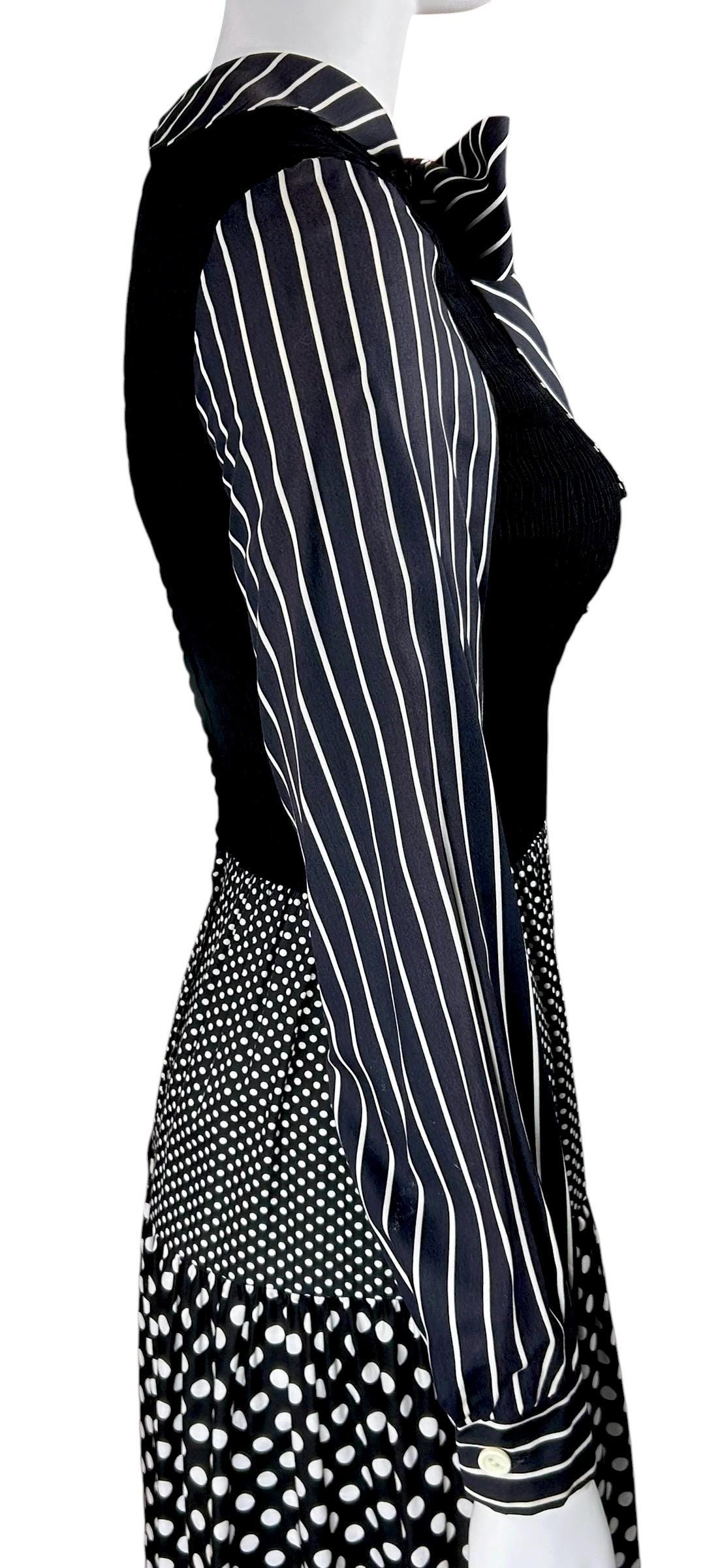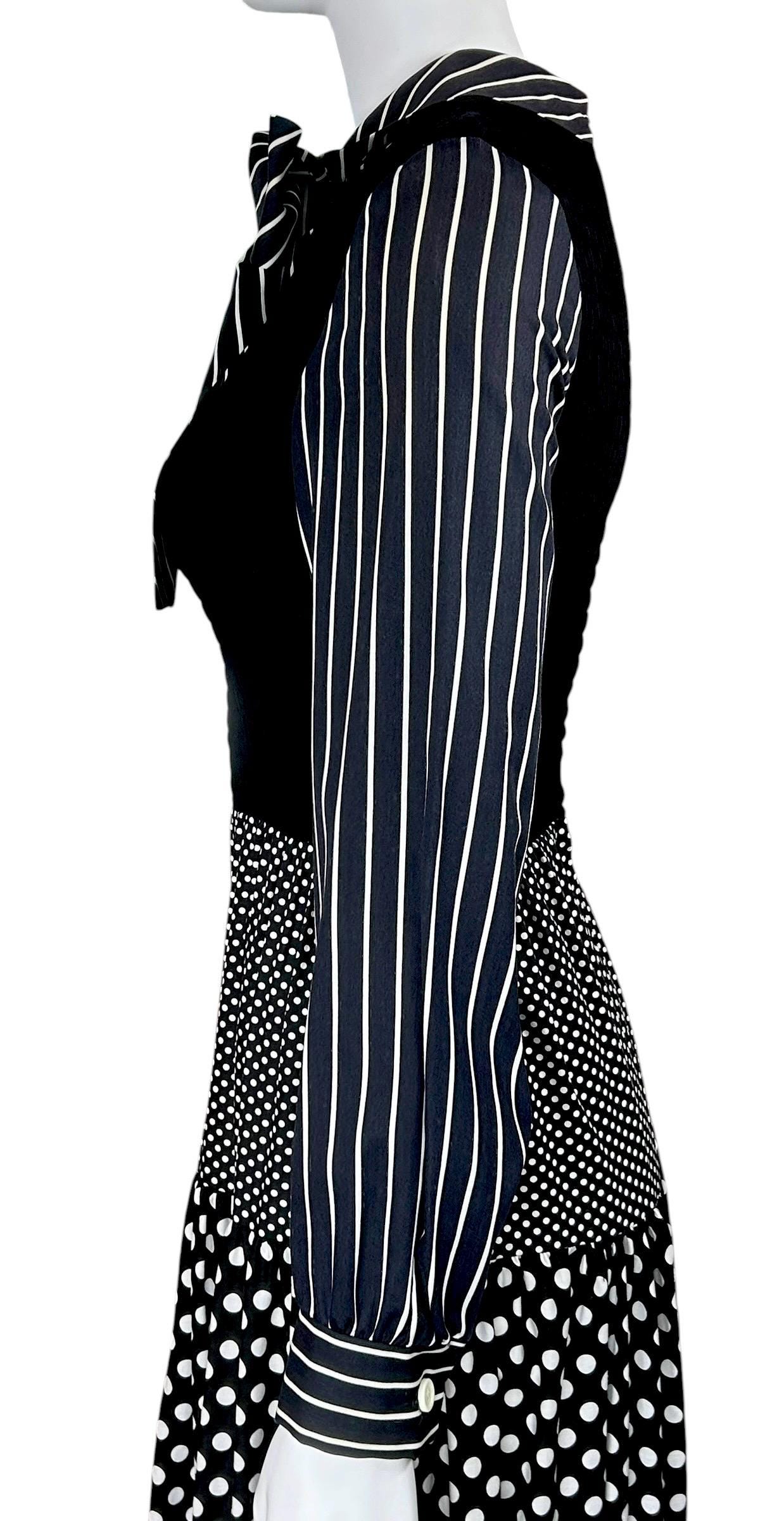 This dress is a classic example of 1970's mixed-print design, a style that often combined bold, contrasting patterns like polka dots and stripes into a single maximalist look.