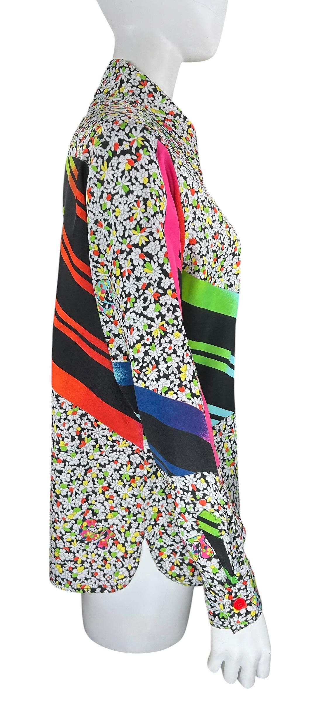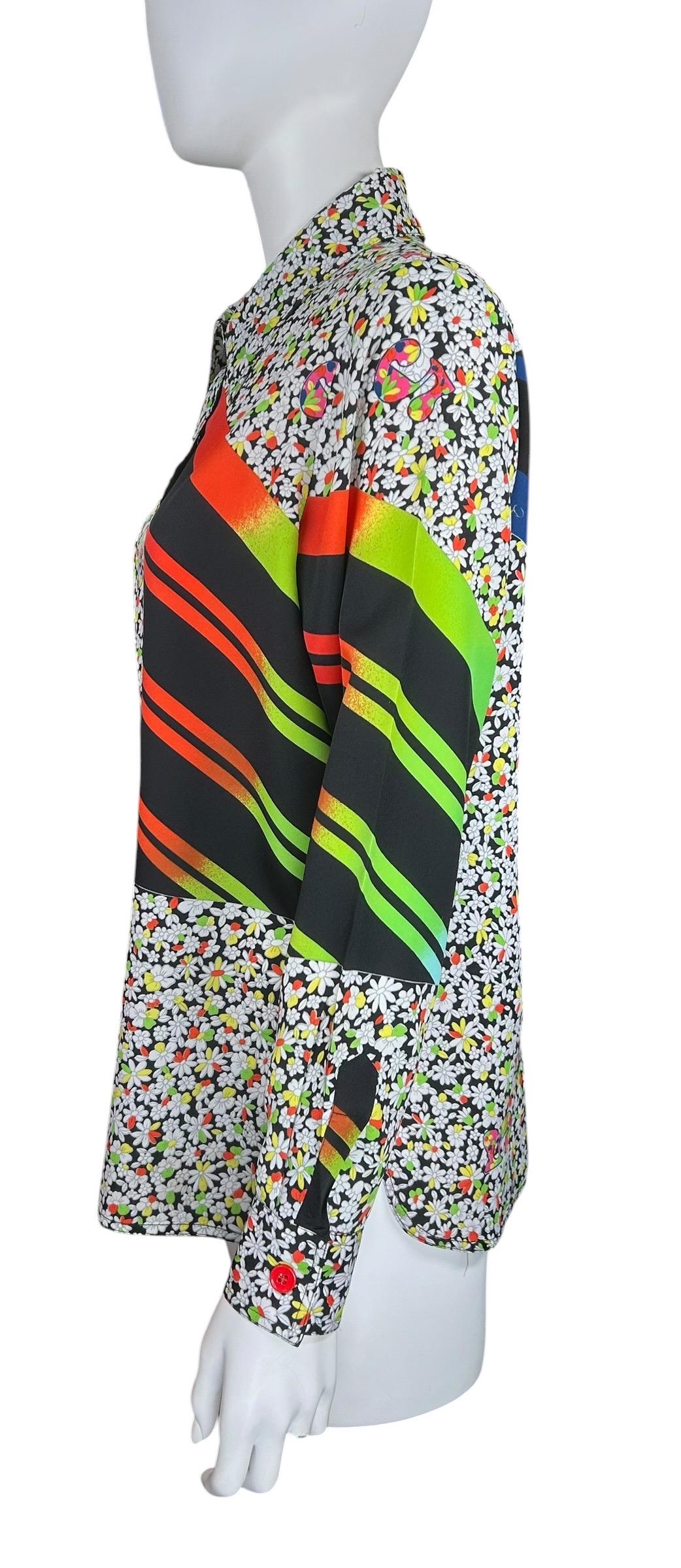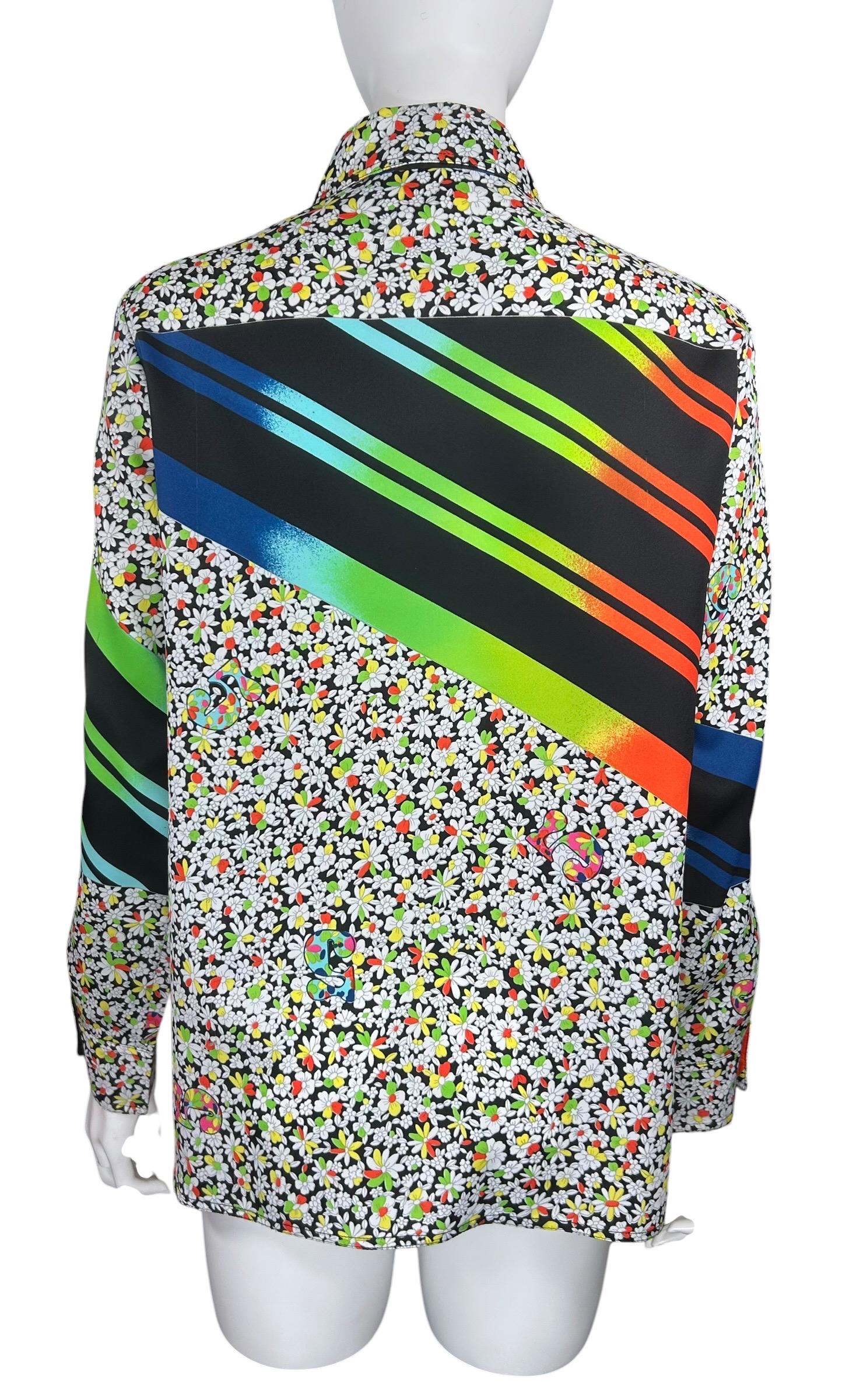 This piece is a groovy mix of patterns with diagonal neon and black stripes contrasted with a dense, colorful daisy floral print. Interestingly, if you look closely at the floral sections, you can sometimes find a numeral "5" hidden in the print.