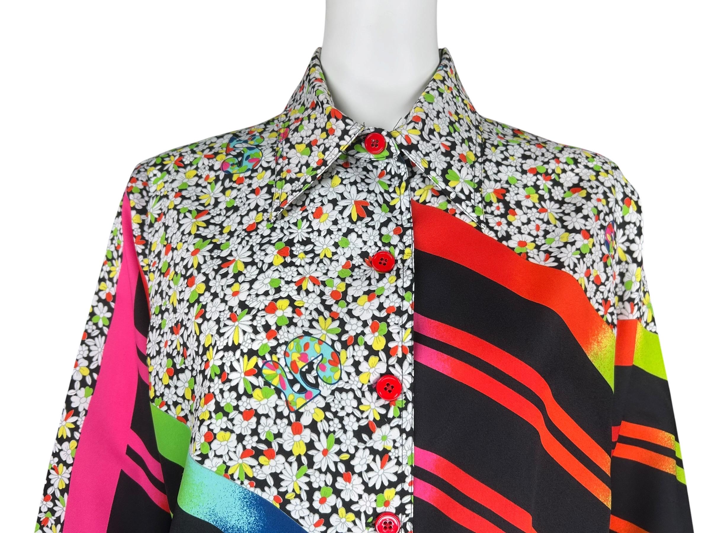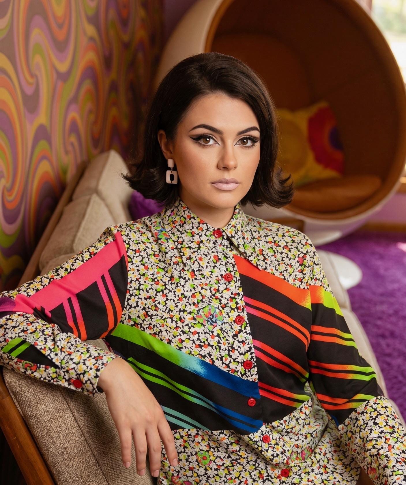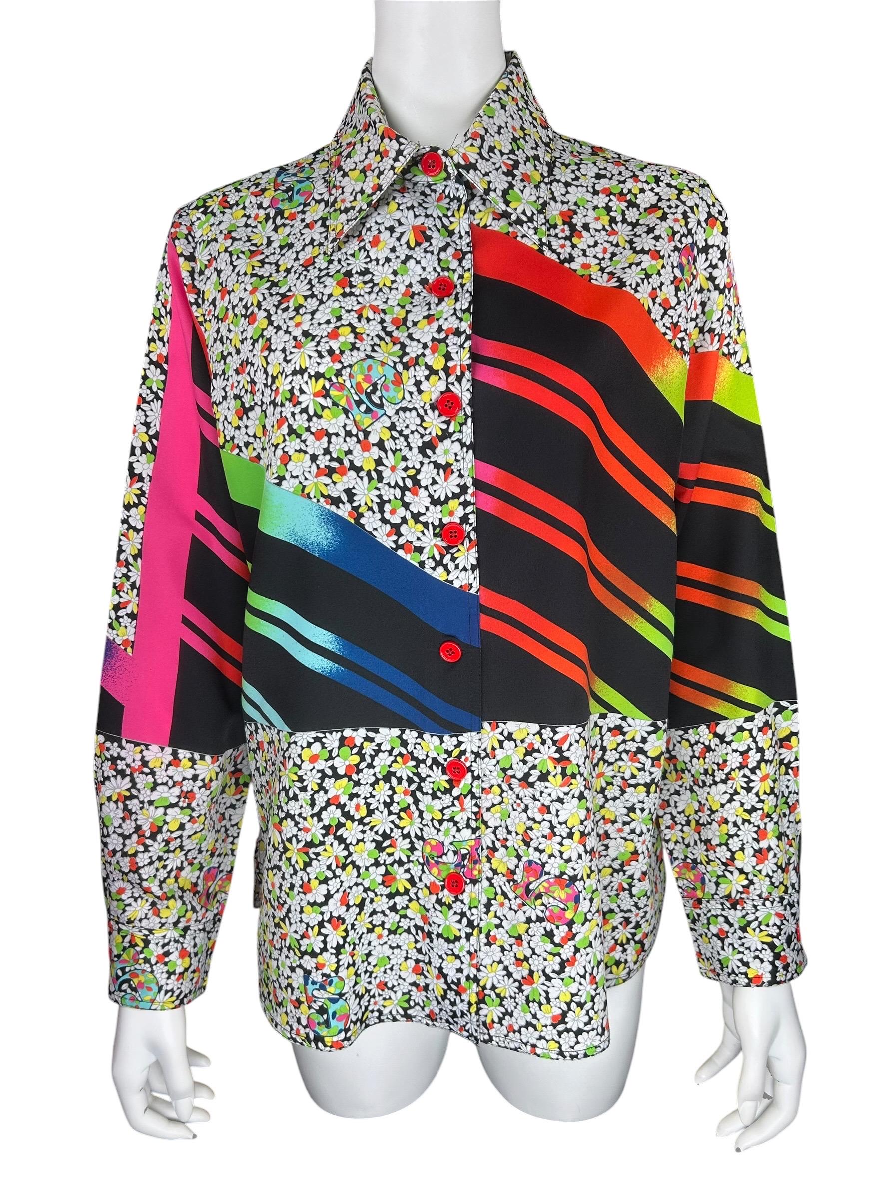 This piece is a groovy mix of patterns with diagonal neon and black stripes contrasted with a dense, colorful daisy floral print. Interestingly, if you look closely at the floral sections, you can sometimes find a numeral "5" hidden in the print.