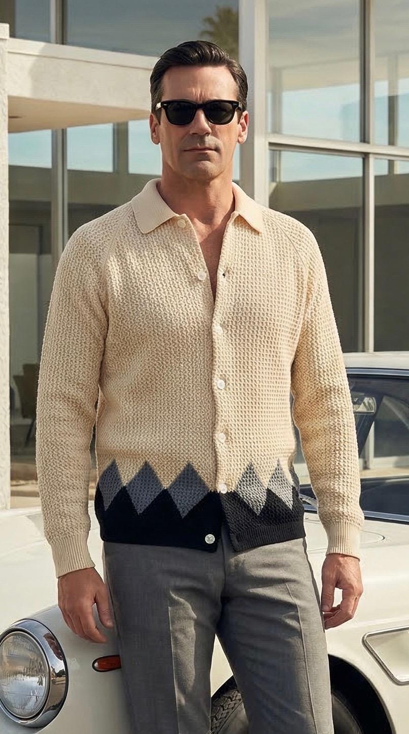Diamond panel knit cardigan features a textured stitch and distinctive geometric pattern along the lower portion.