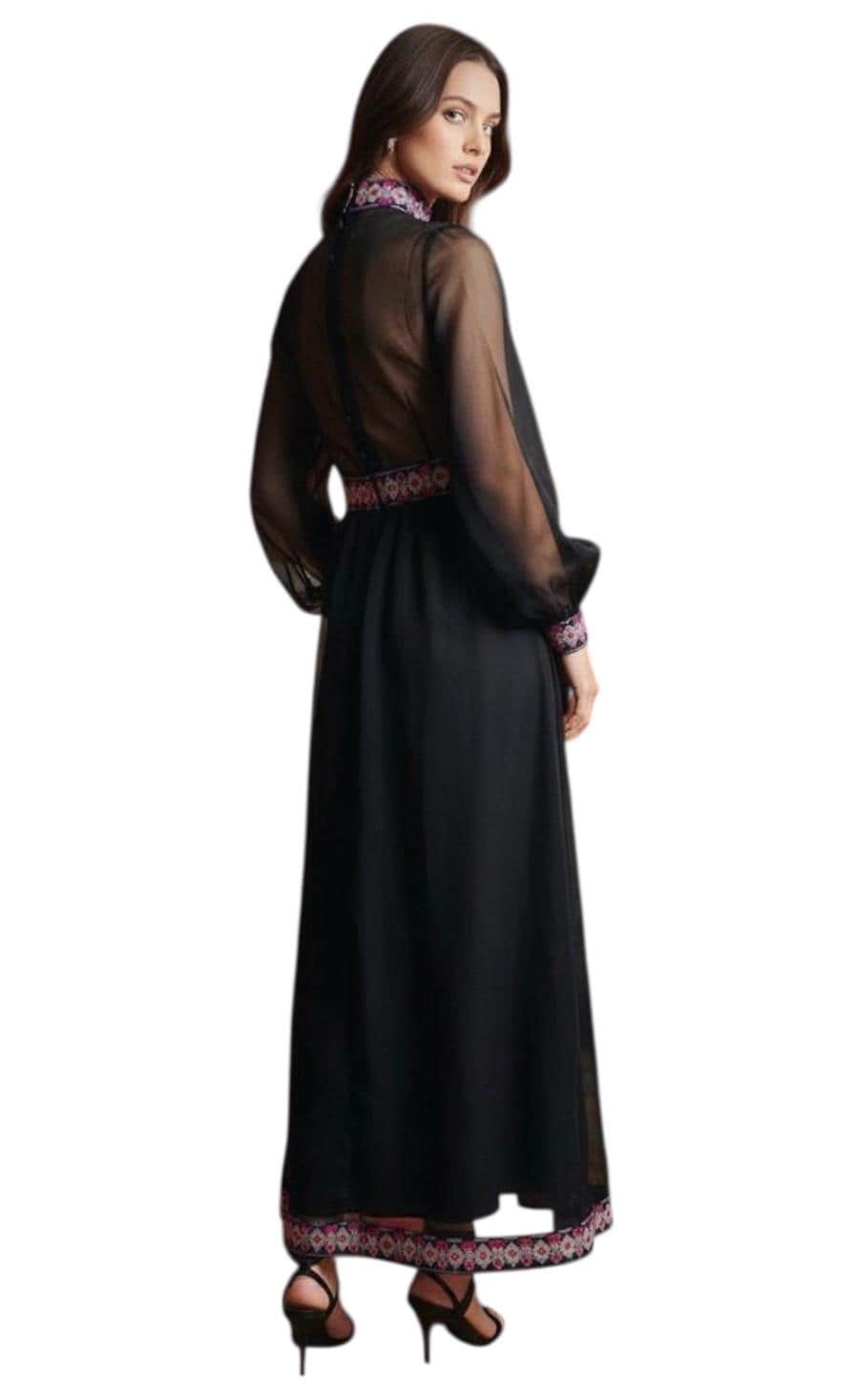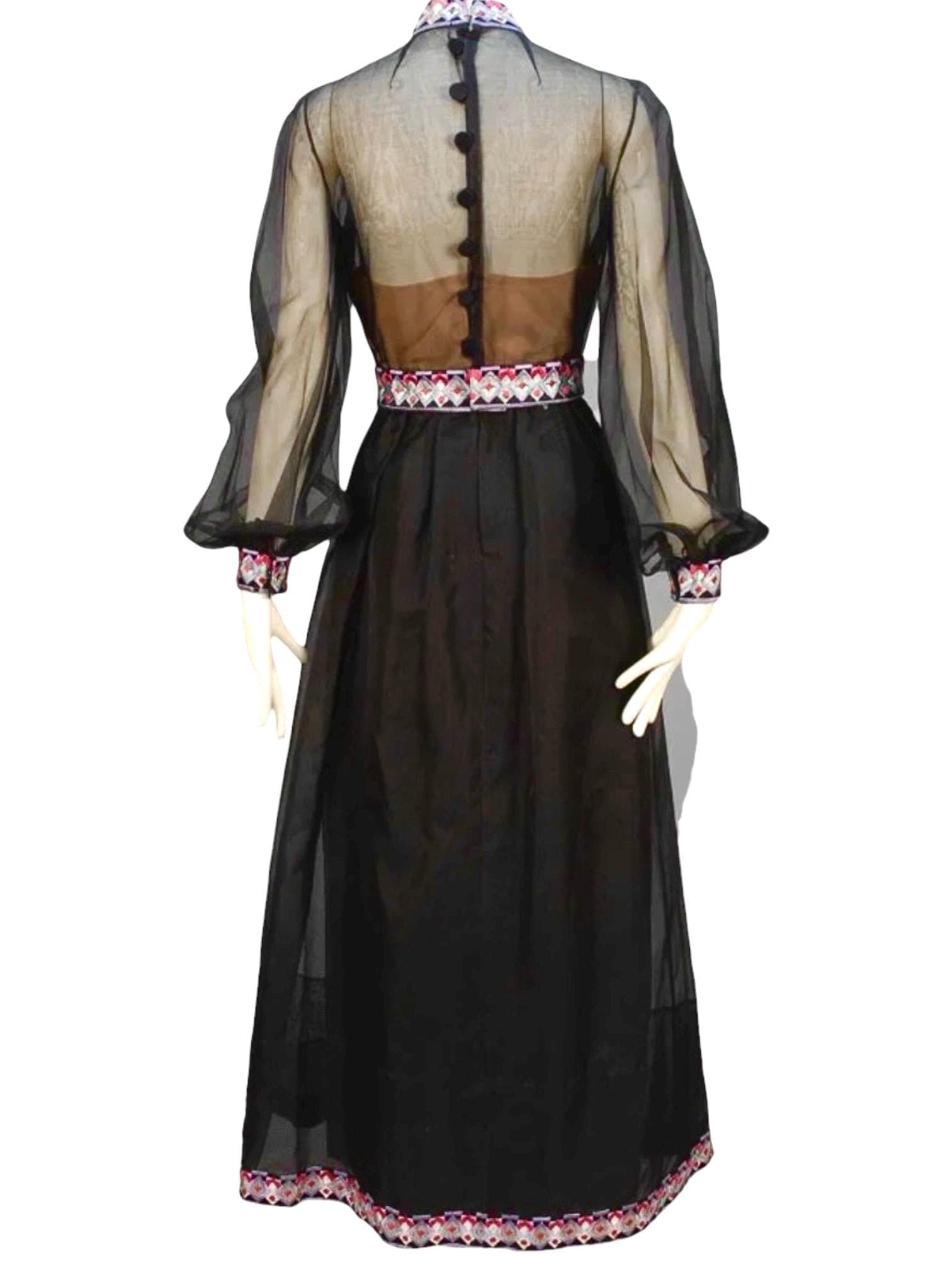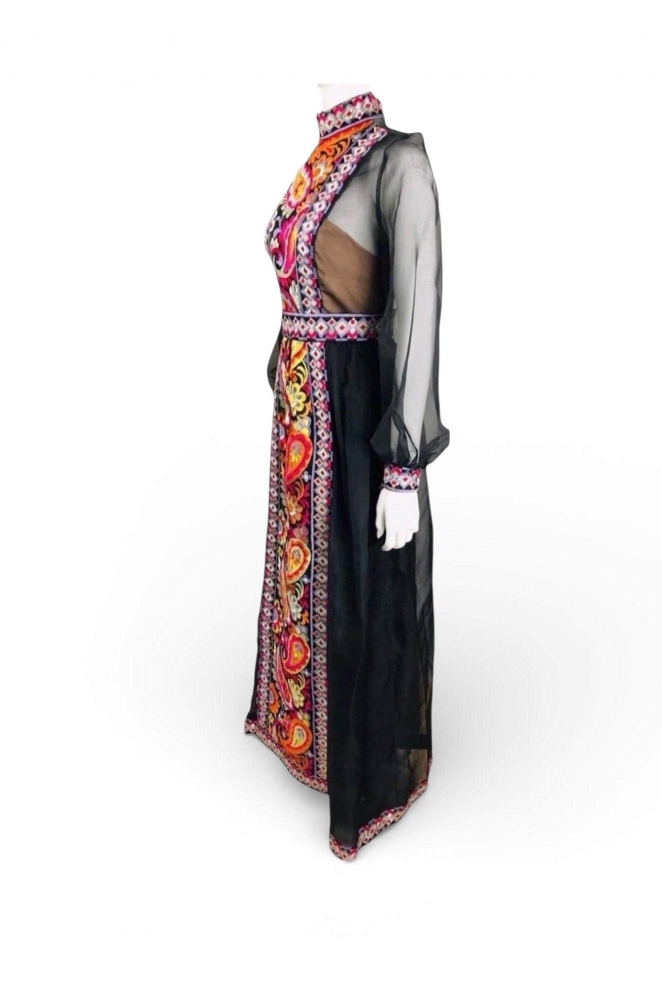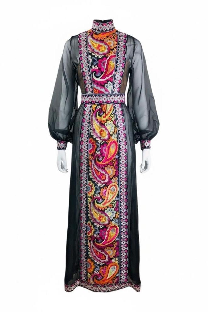 Black silk organza with psychedelic paisley and flower embroidery down the midline.