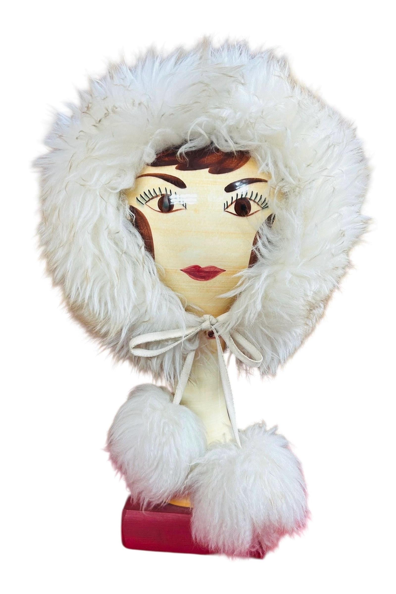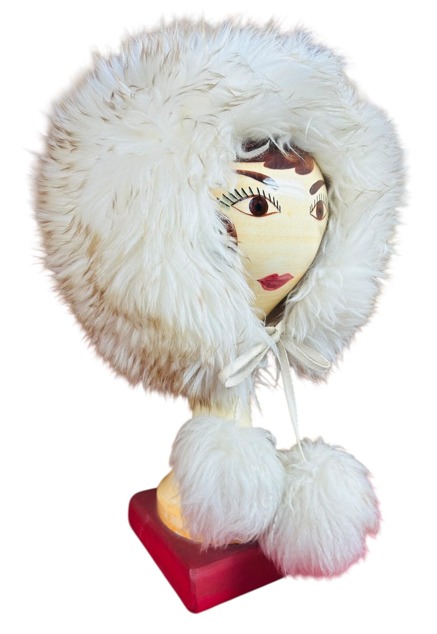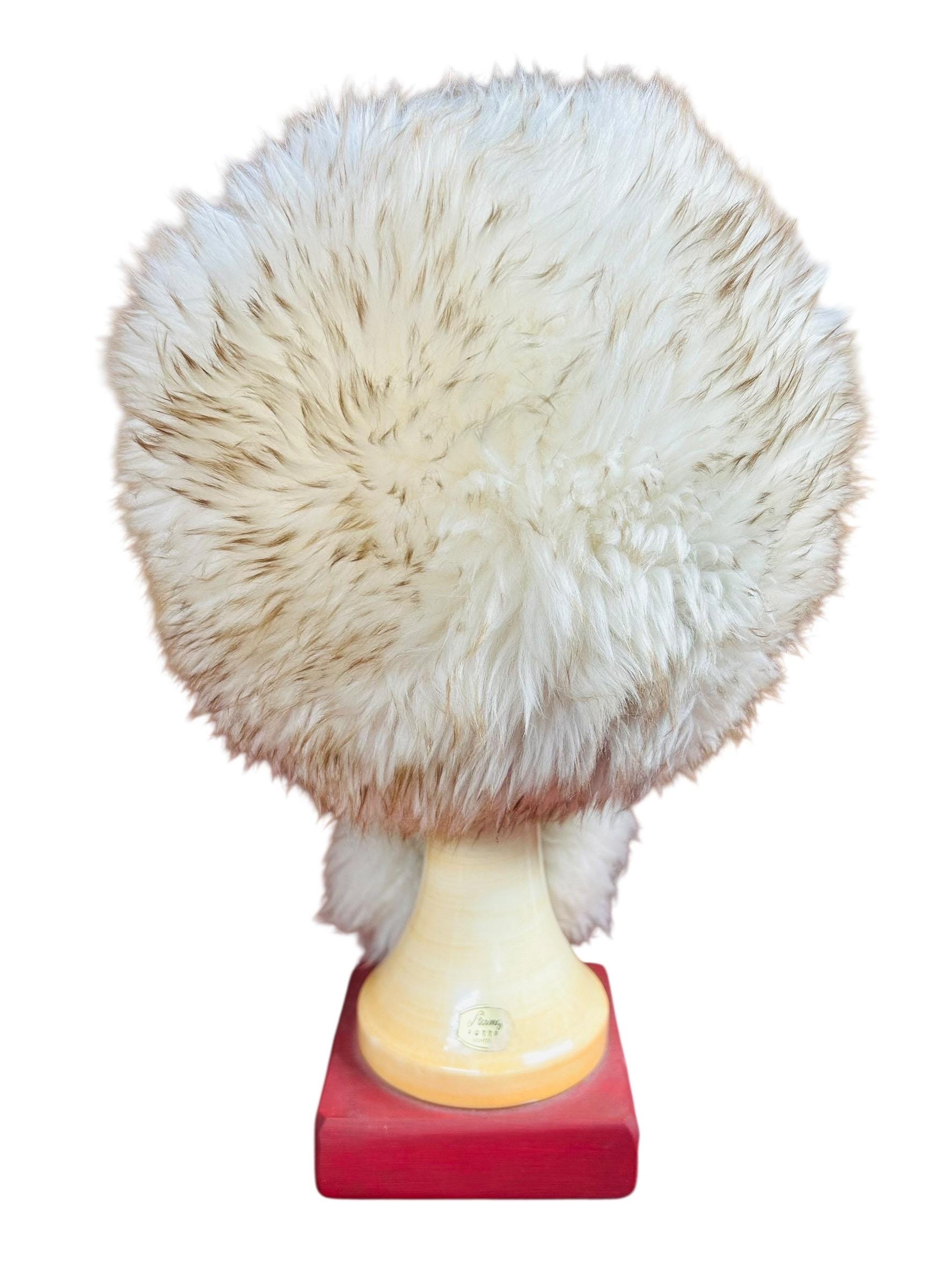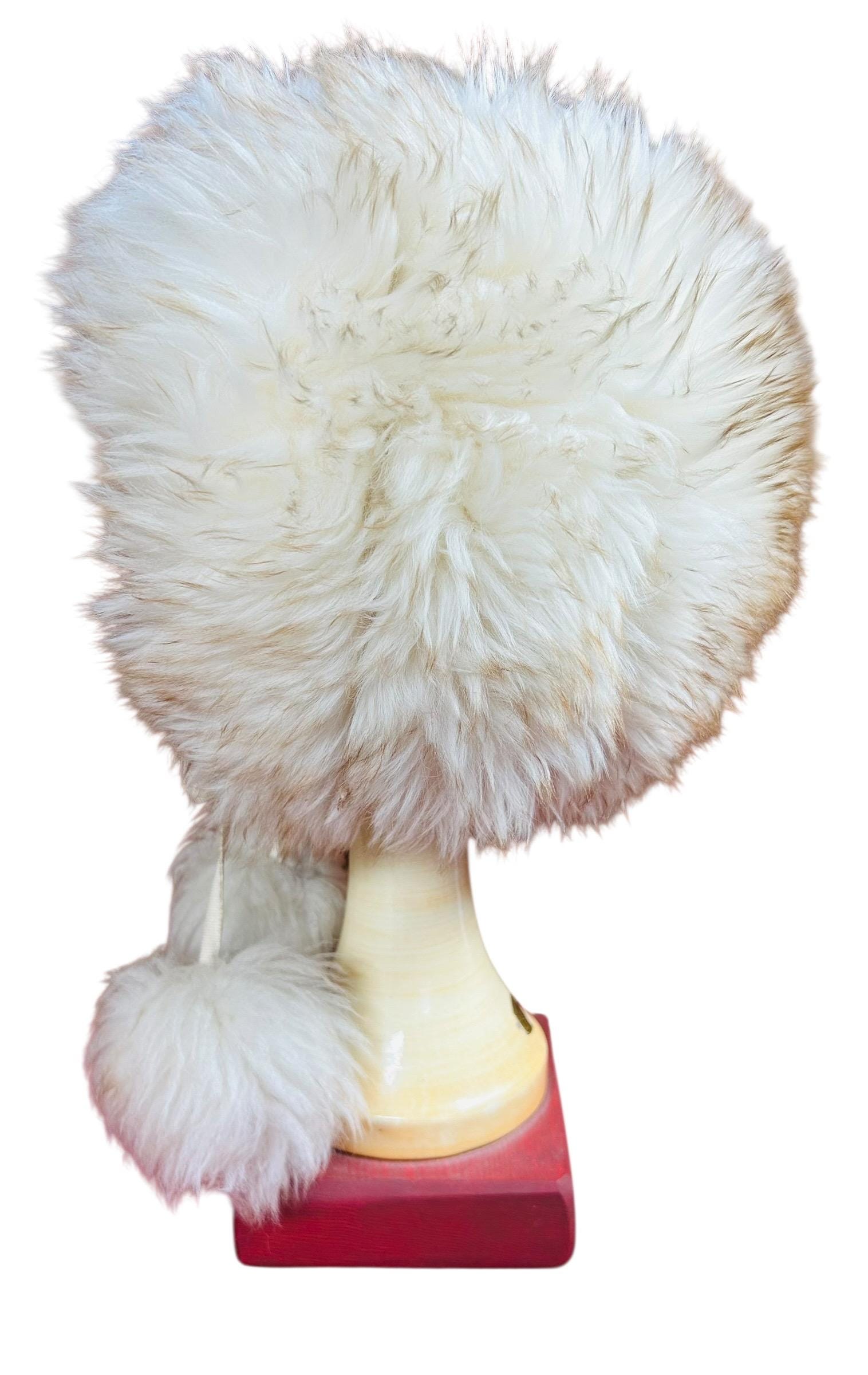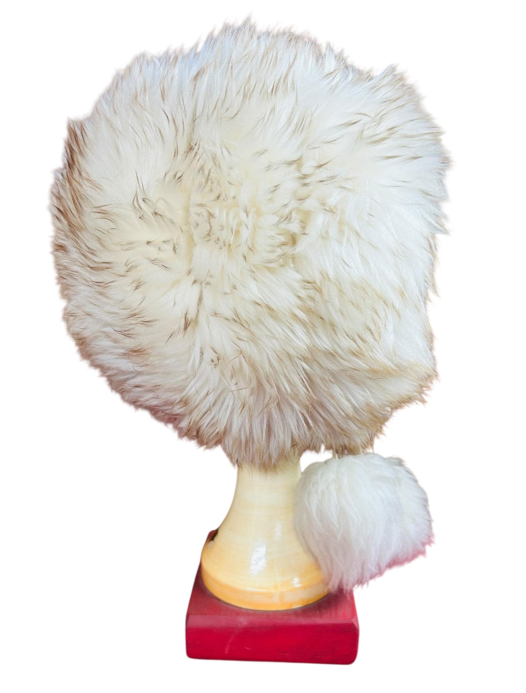 This fluffy furry hat is Sheepskin in White color with Brown Tips, called Carmelized or Burnt Ends. A process where they actually burn the ends just enough to give them that beautiful brown tip which adds dimension to the hat. The hat ties at the chin and has these big round sheepskin pom poms that just put it over the top. Fur is plush and soft.